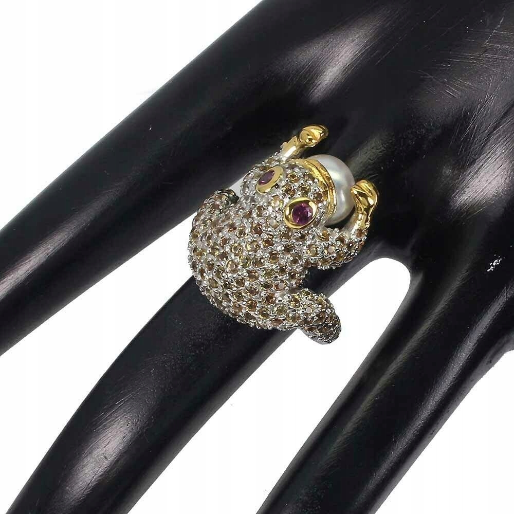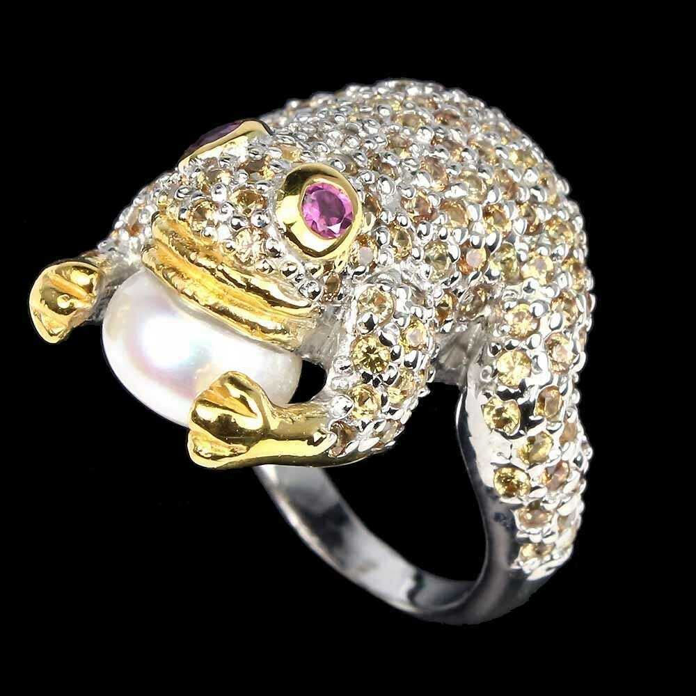oferujemy Państwu nowy, pozłacany 14K białym i żółtym złotem, srebrny - próba 925 pierścionek z naturalnymi szafirami, granatami (rodolitami) i perłą.