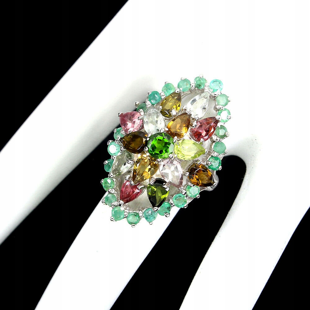 oferujemy Państwu nowy pozłacany białym złotem 14K, srebrny - próba 925 pierścionek z naturalnymi turmalinami, diopsydami i szmaragdami.