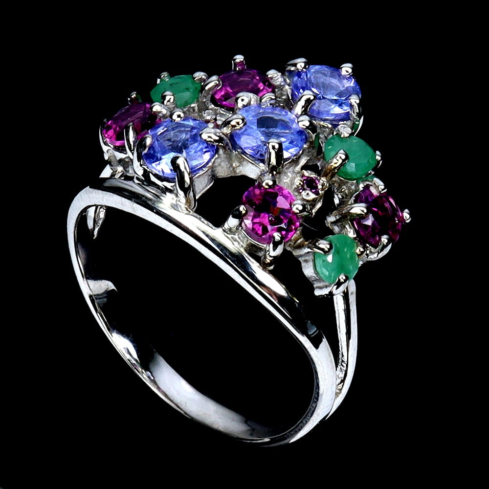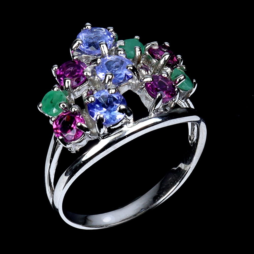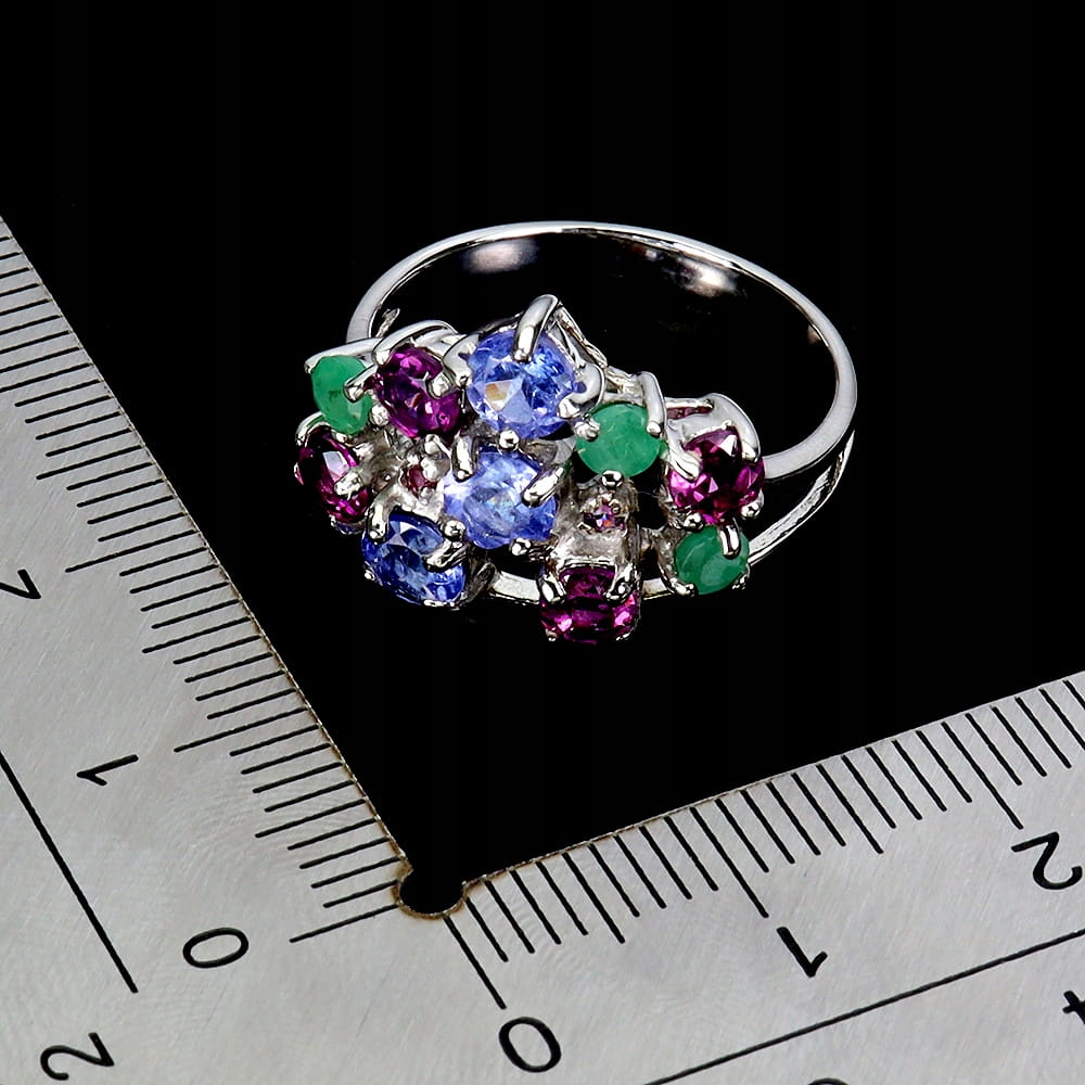Oferujemy Państwu pozłacany białym złotem 14K, srebrny - próba 925- pierścionek z naturalnymi szmaragdami, tanzanitami i granatami (rodolitami).