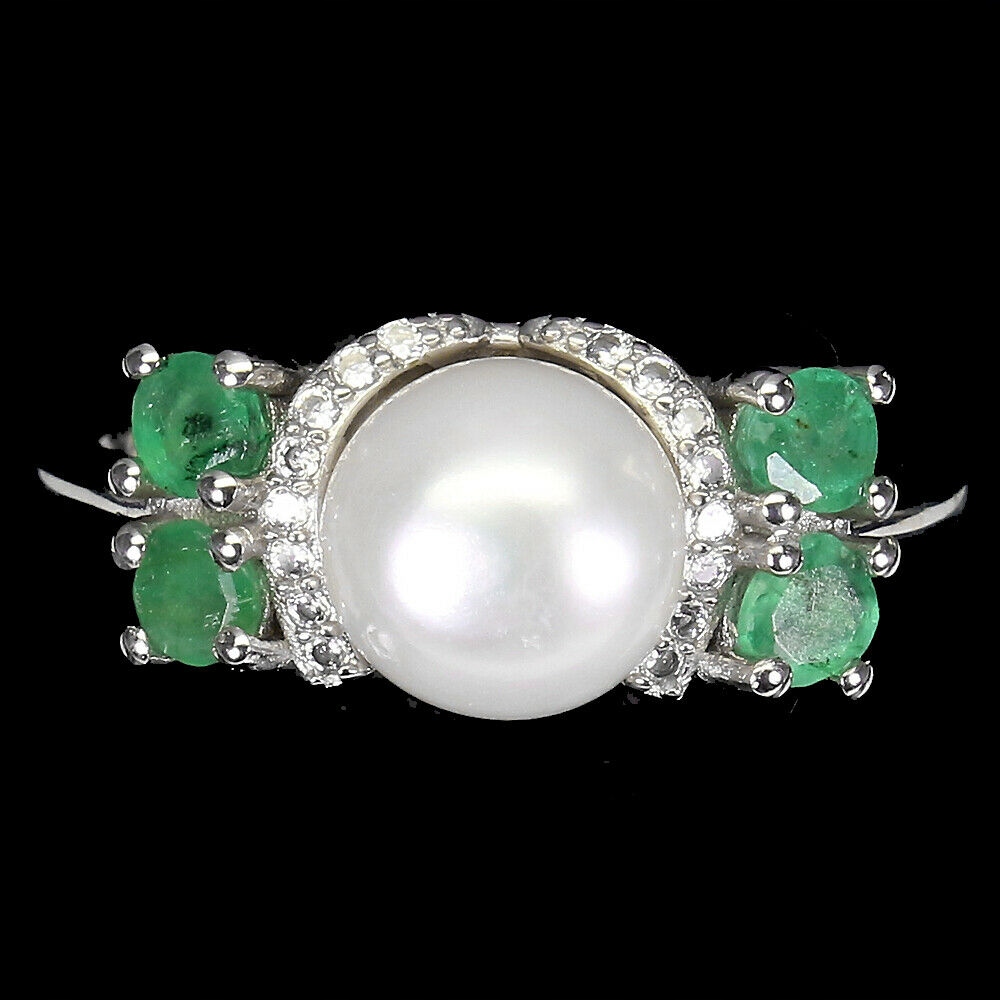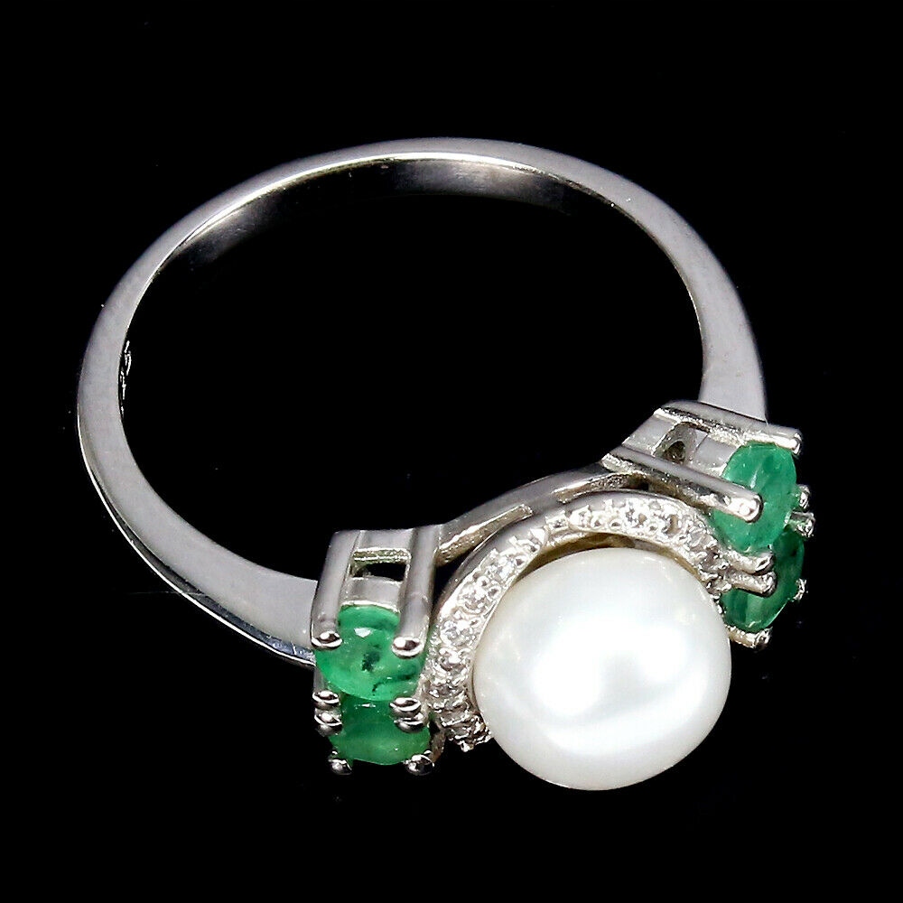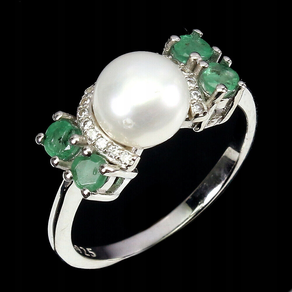Oferujemy Państwu nowy, srebrny - próba 925- pozłacany 14K białym złotem, pierścionek z naturalnymi szmaragdami, perłą i cyrkoniami.