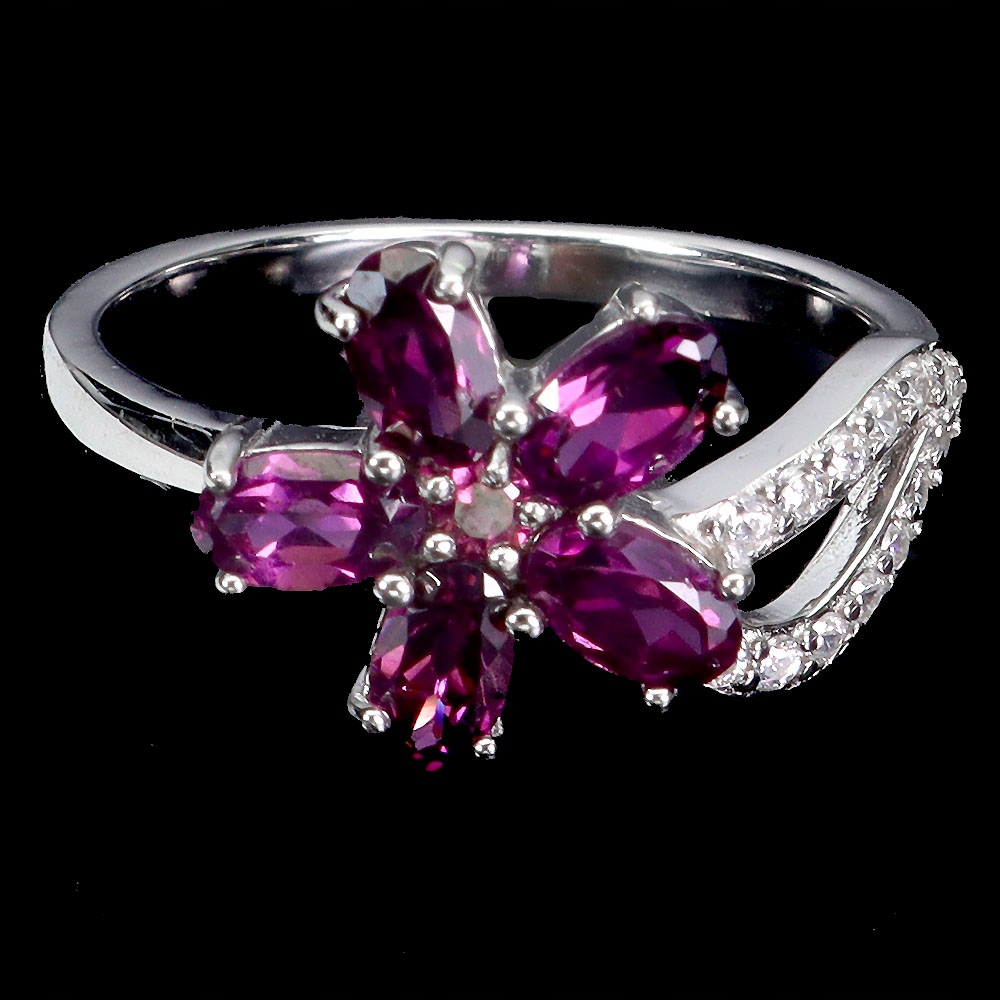 Oferujemy Państwu pozłacany 14K białym złotem, srebrny - próba 925 pierścionek z naturalnymi granatami (rodolitami) i cyrkoniami.