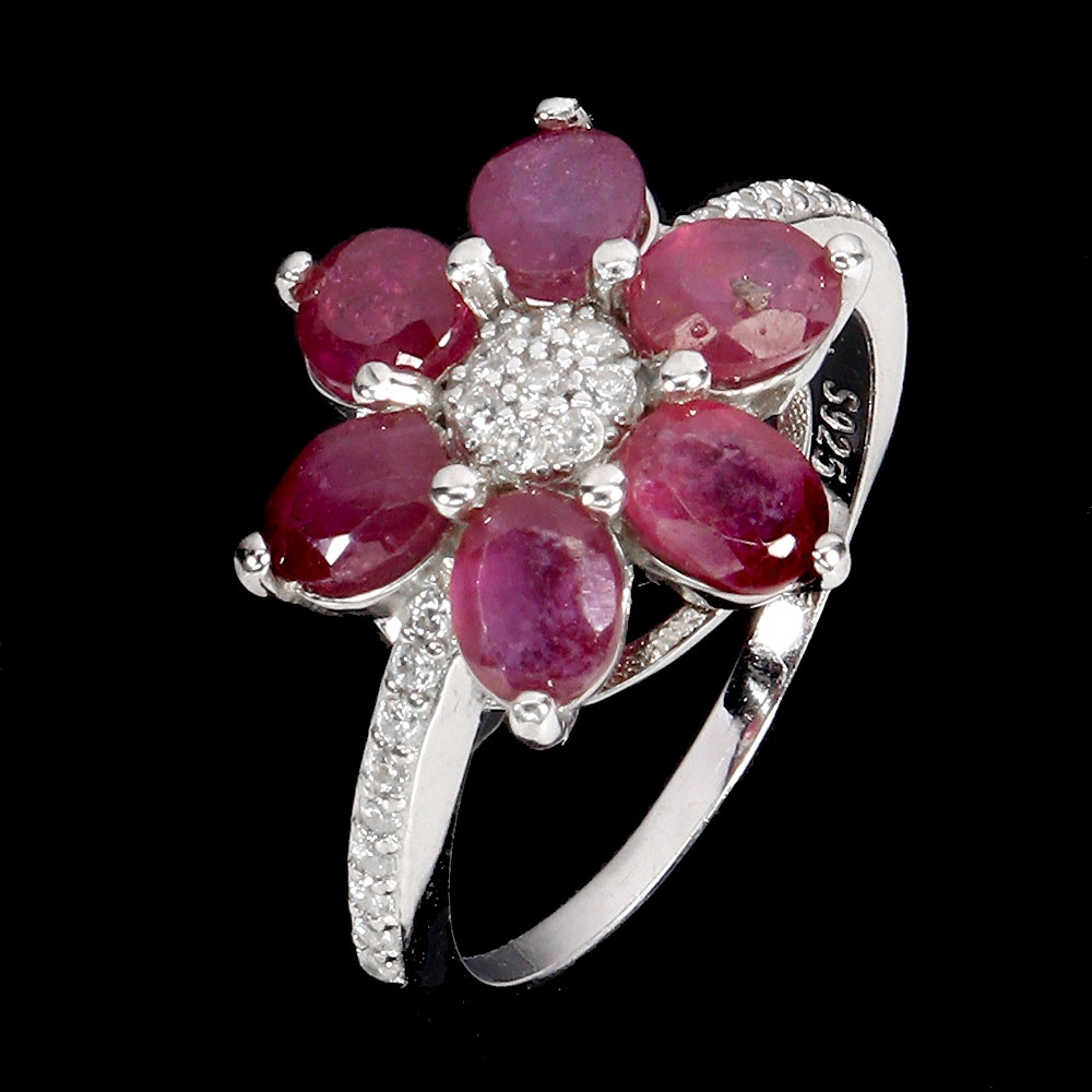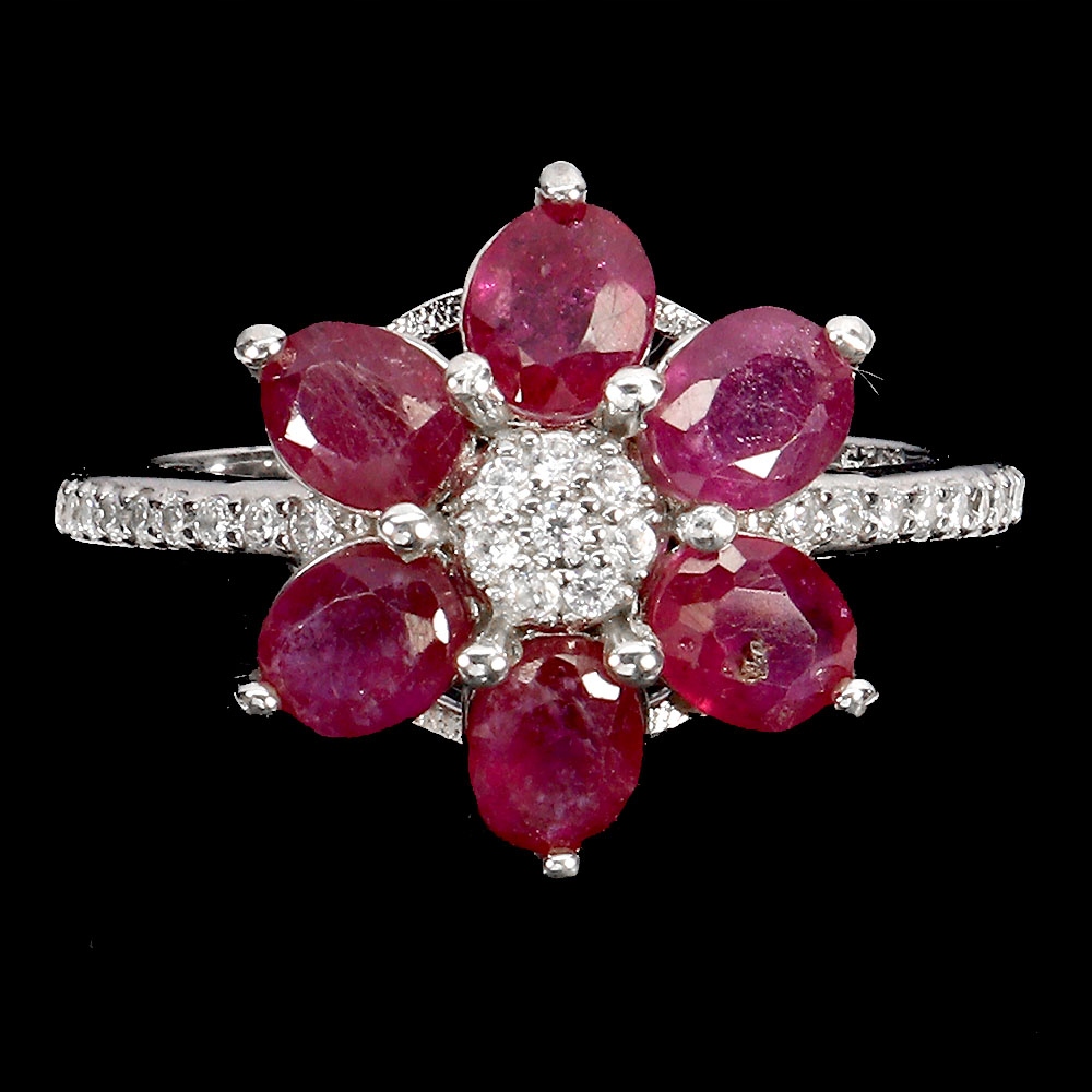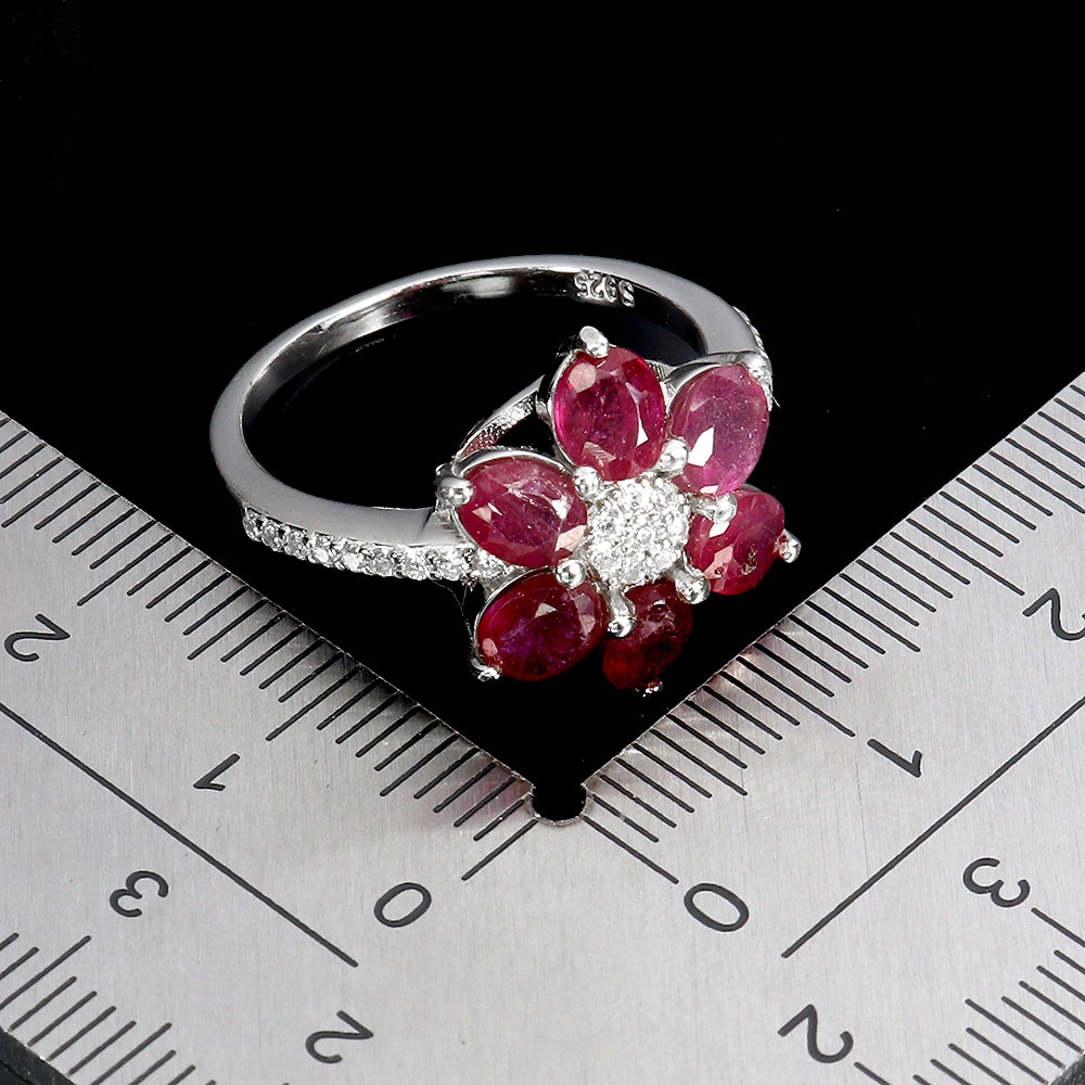 Pierścionek r 16 elegancki srebrny naturalne rubiny cyrkonie kwiat