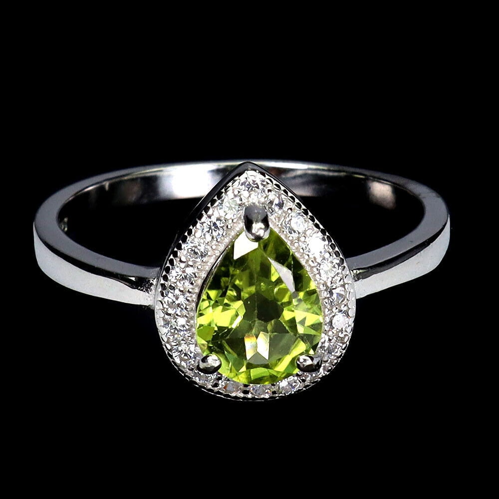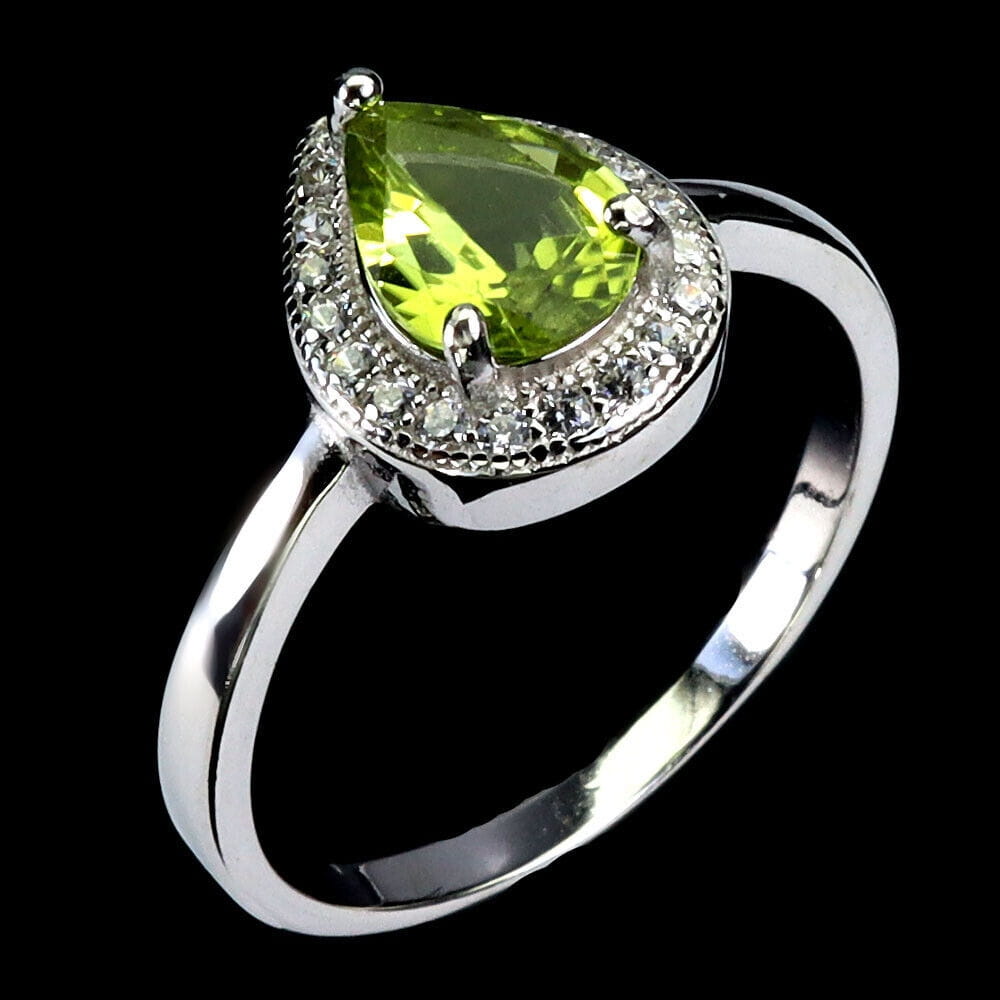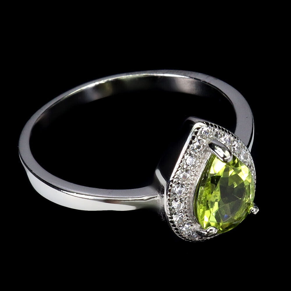 Oferujemy Państwu nowy, pozłacany 14K białym złotem, srebrny - próba 925 - pierścionek z naturalnym oliwinem i cyrkoniami.