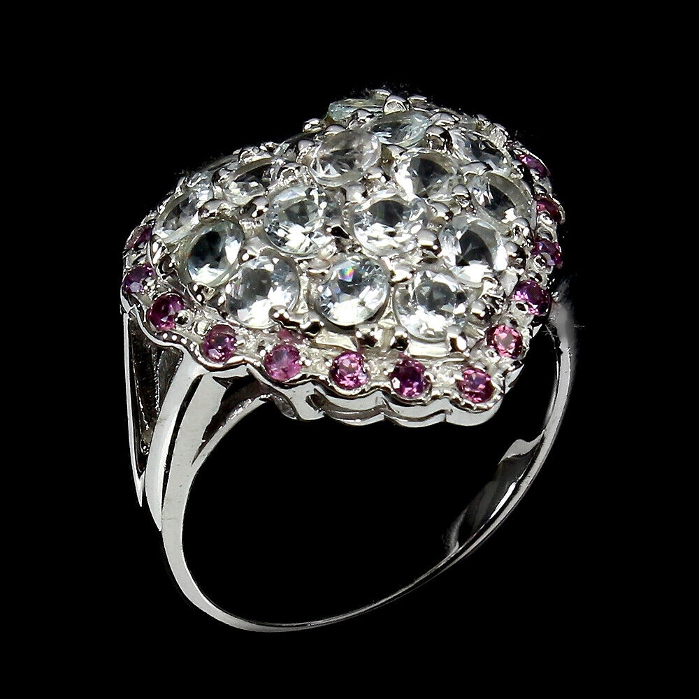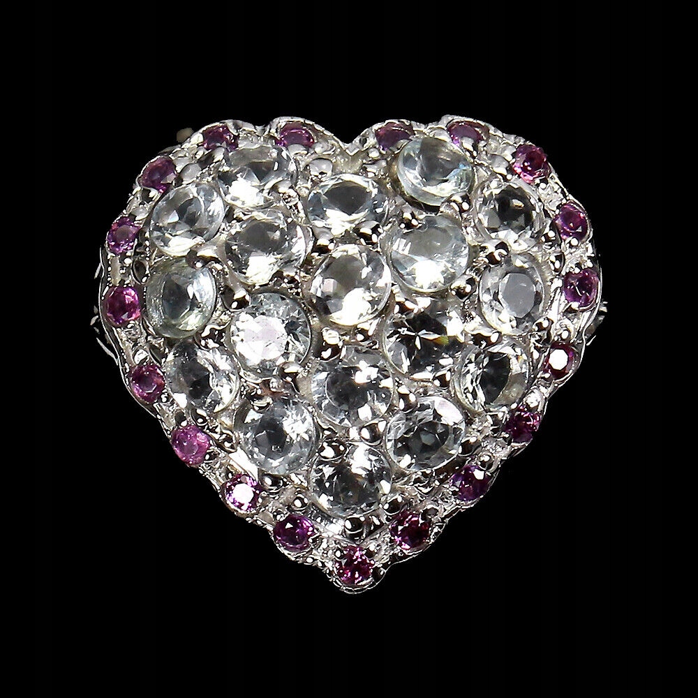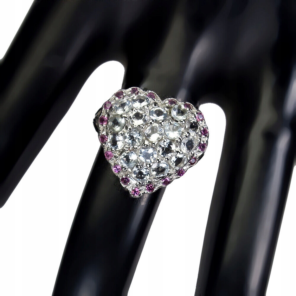 Oferujemy Państwu nowy, srebrny - próba 925- pozłacany 14K białym złotem pierścionek z naturalnymi akwamarynami i granatami (rodolitami).