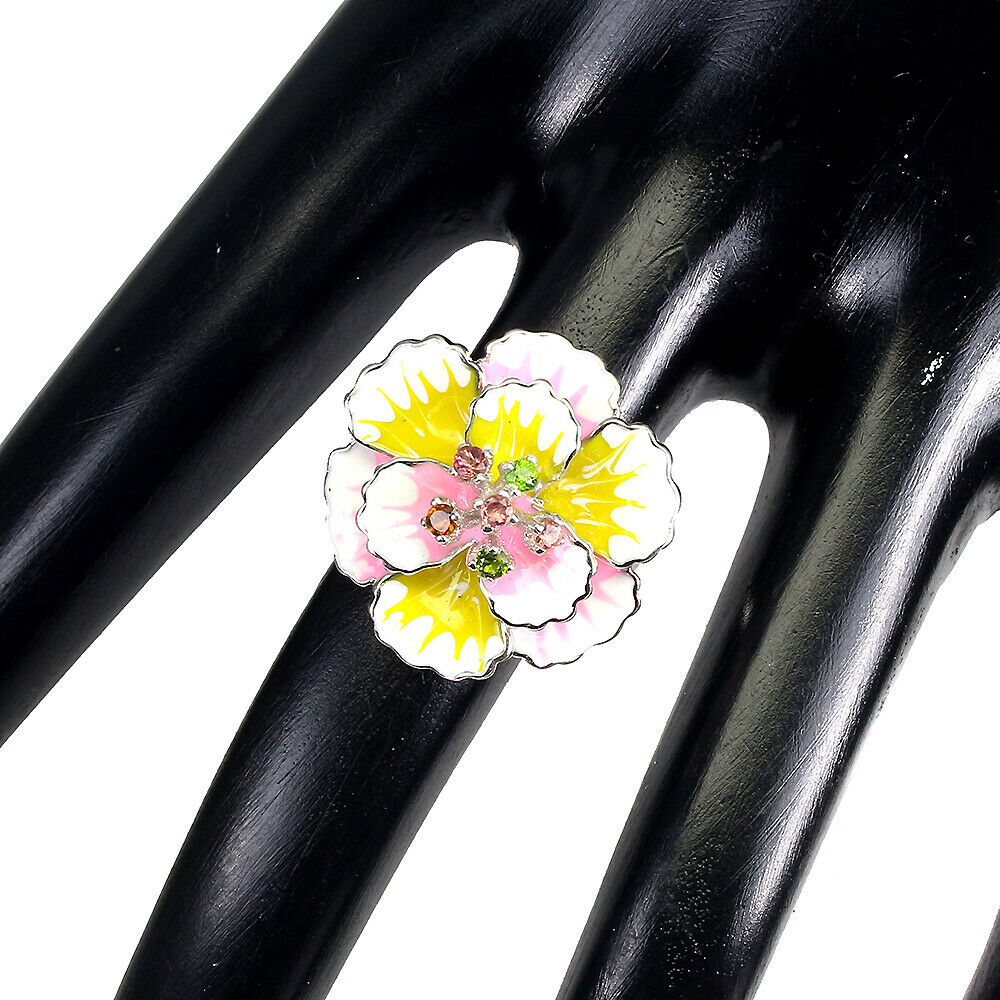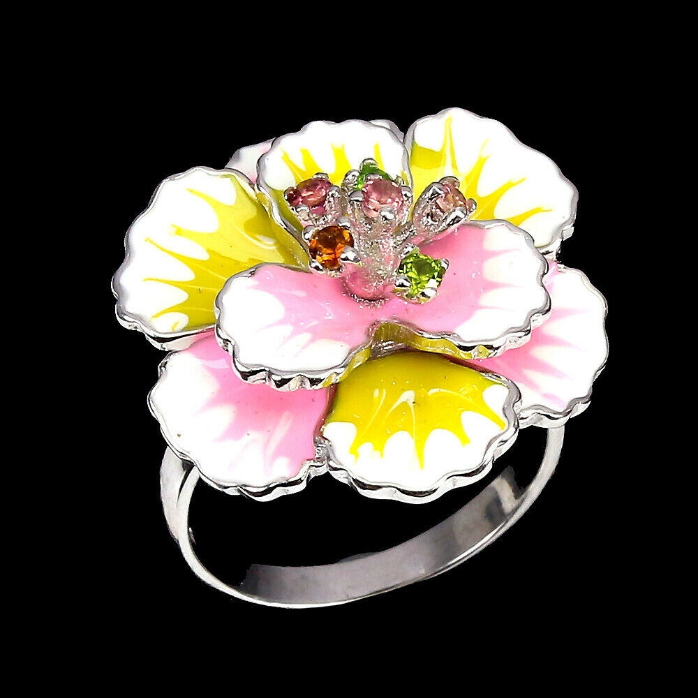 Pierścionek srebrny 925 emalia kwiat turmaliny r15