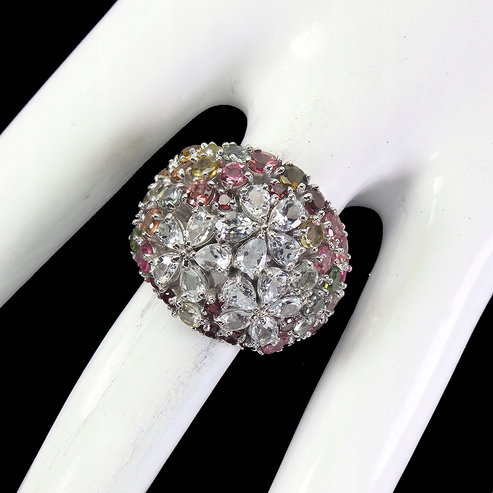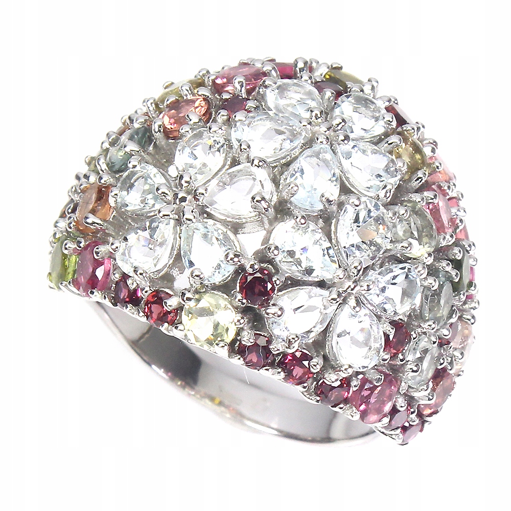 Oferujemy Państwu nowy, srebrny - próba 925- pozłacany 14K białym złotem, pierścionek z naturalnymi akwamarynami, turmalinami i granatami (rodolitami).