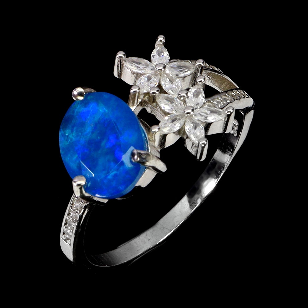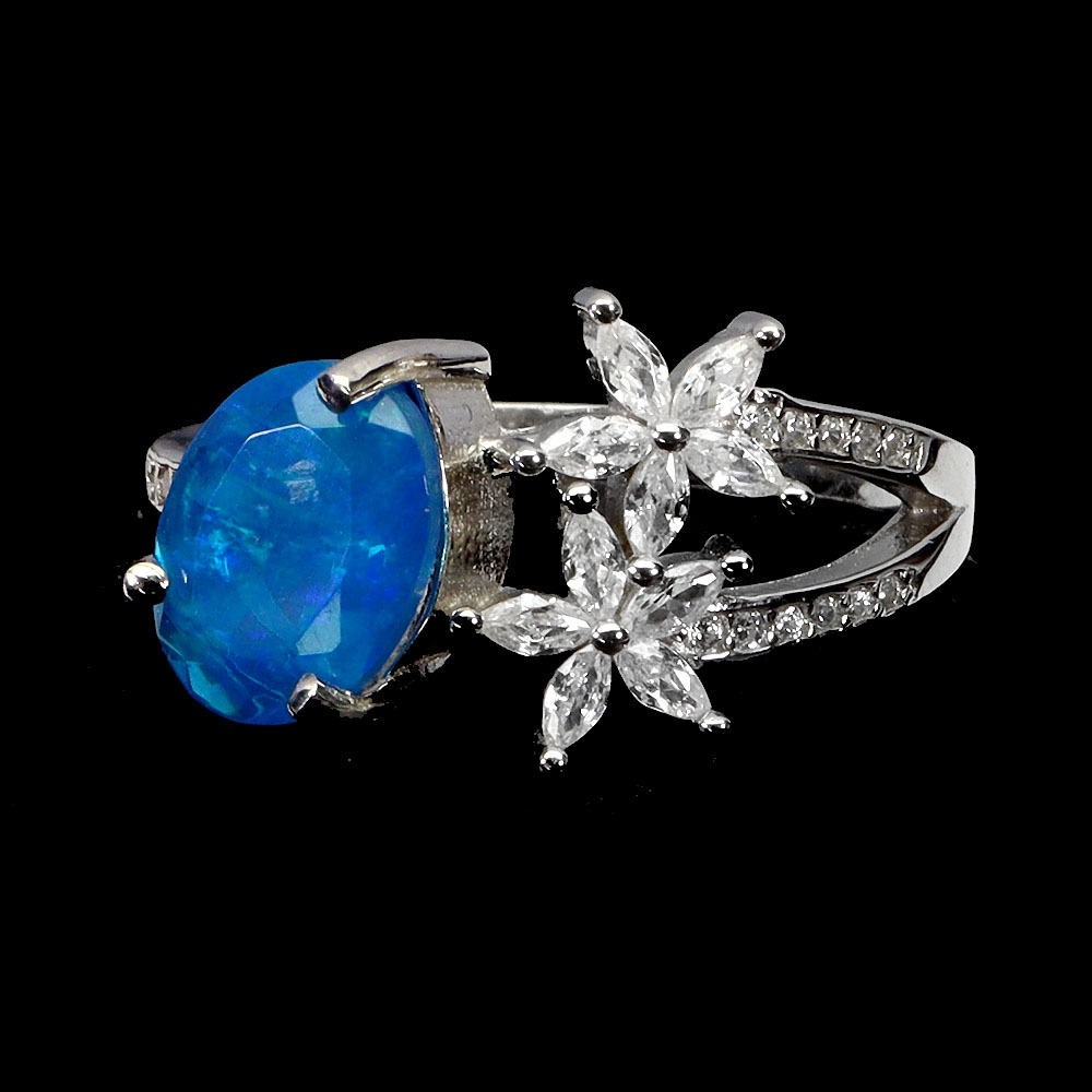 Oferujemy Państwu pozłacany 14K białym złotem, srebrny - próba 925 - pierścionek z naturalnym niebieskim opalem i cyrkoniami.