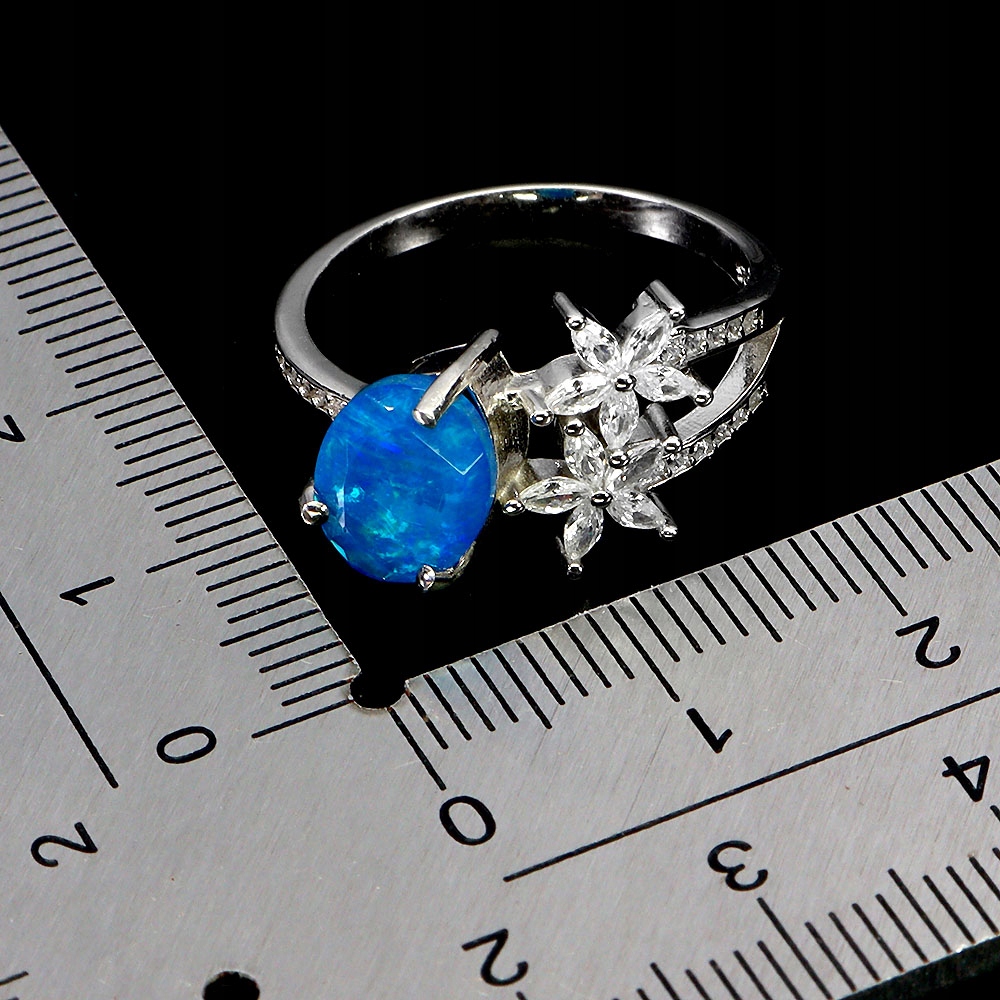 Pierścionek srebrny delikatny r 14 naturalny opal niebieski cyrkonie 925