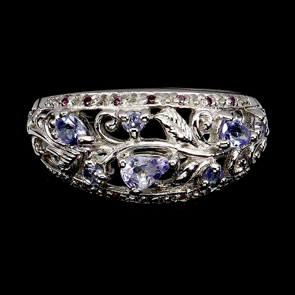 Oferujemy Państwu pozłacany białym złotem 14K, srebrny - próba 925 - pierścionek z naturalnymi granatami (rodolitami) i tanzanitami.