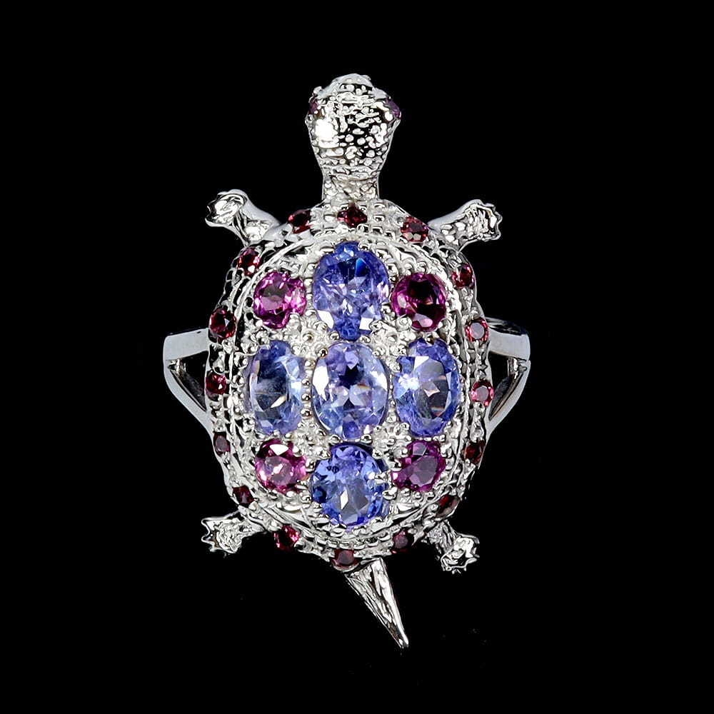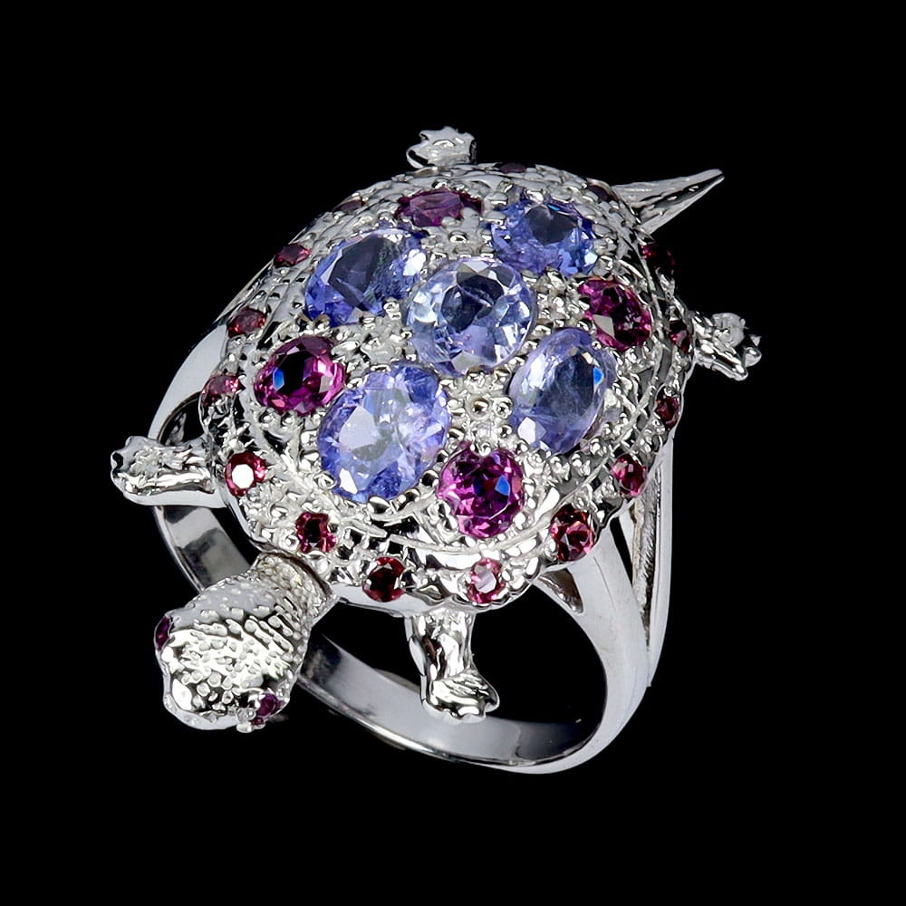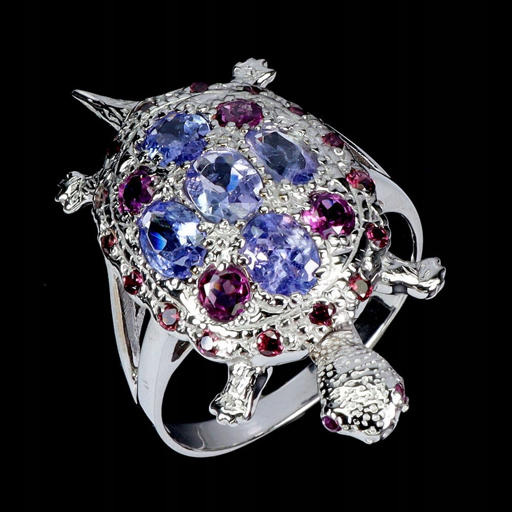 Pierścionek srebrny uroczy żółw naturalne rodolity granaty tanzanity r 16.5