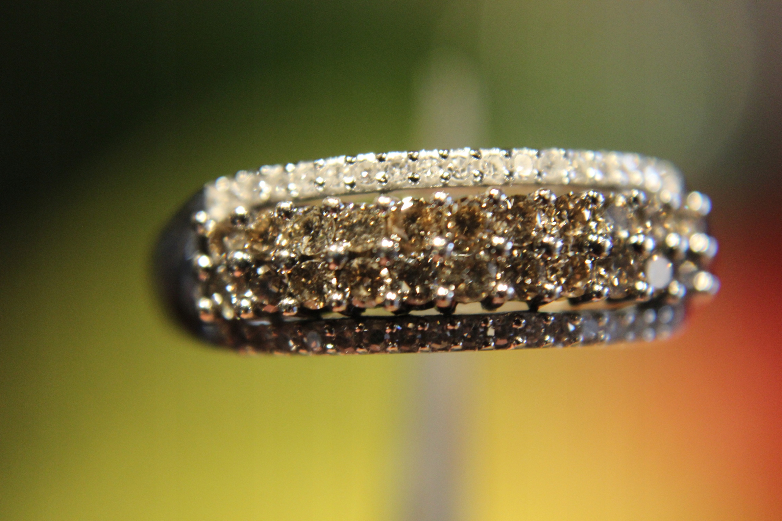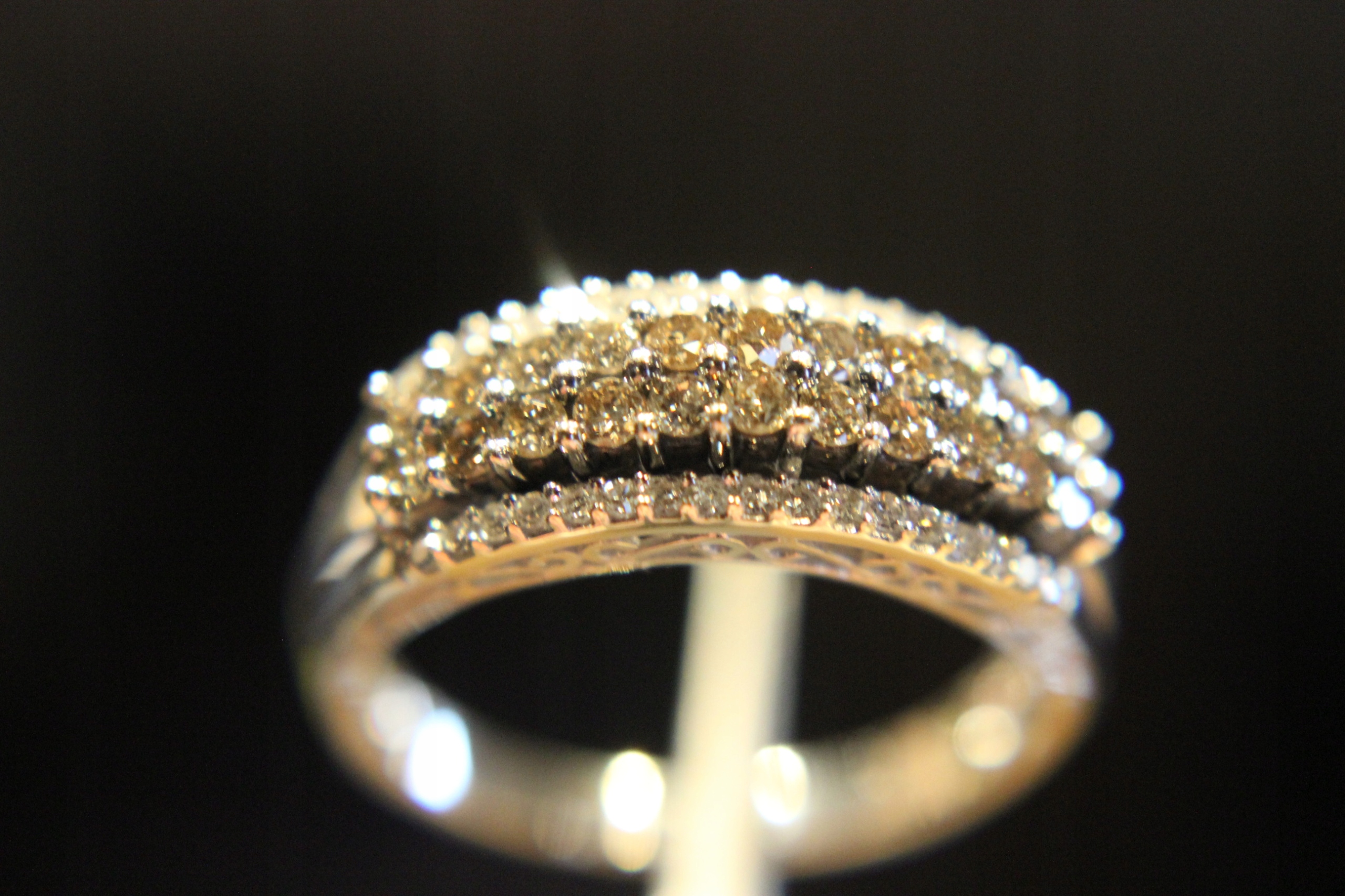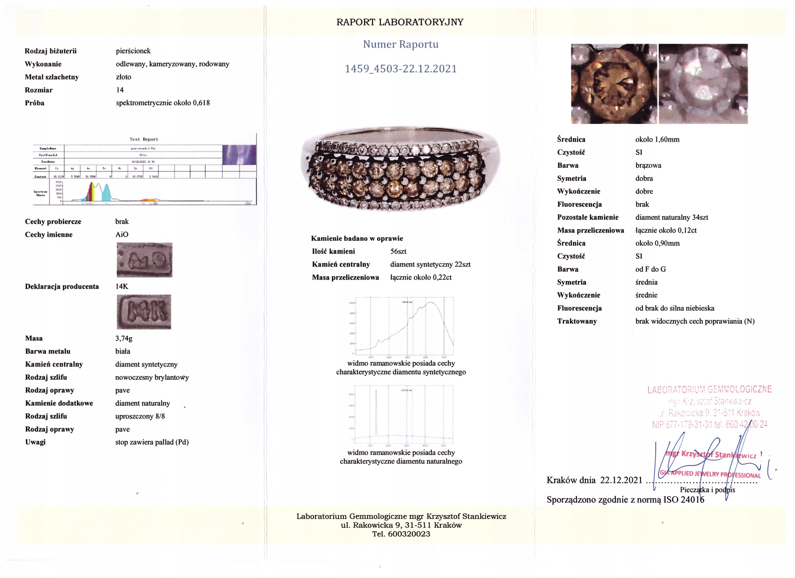 Kamień centralny: diament syntetyczny 22 szt. około 0.22ct. Czystość SI. Barwa brązowa.