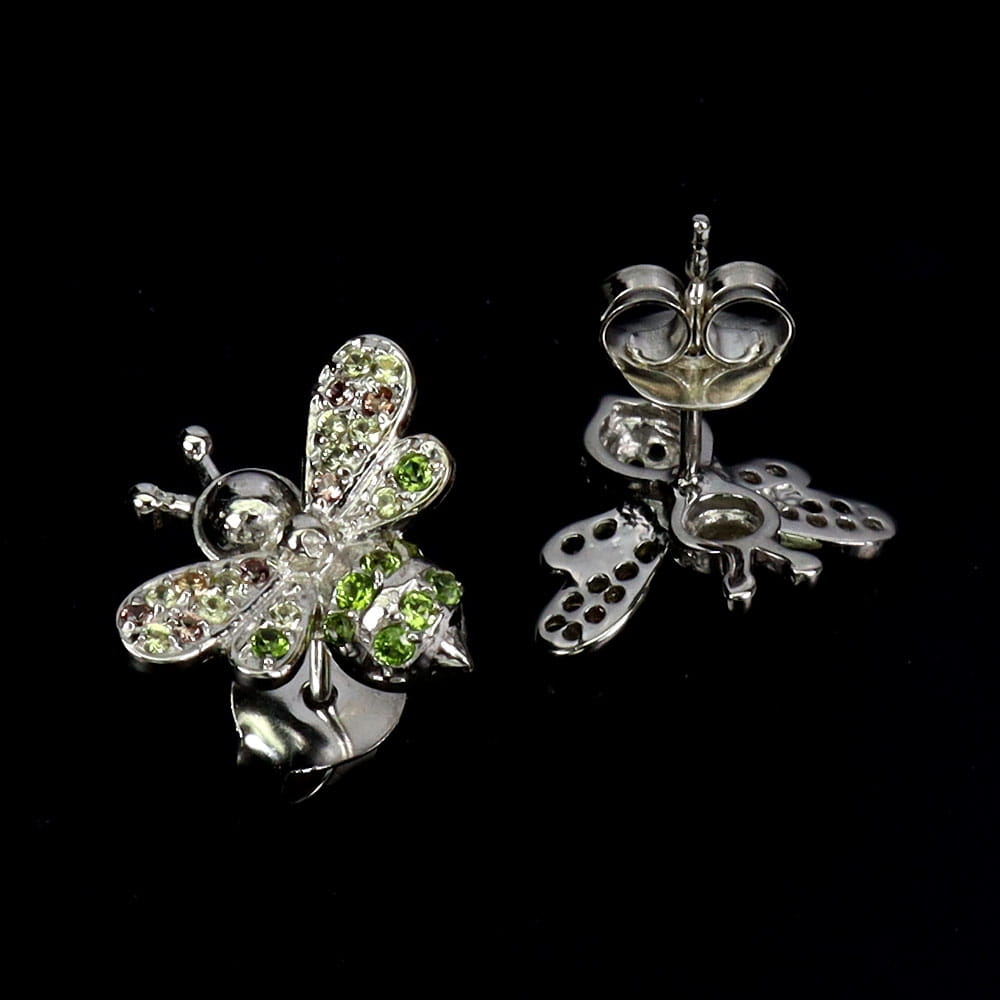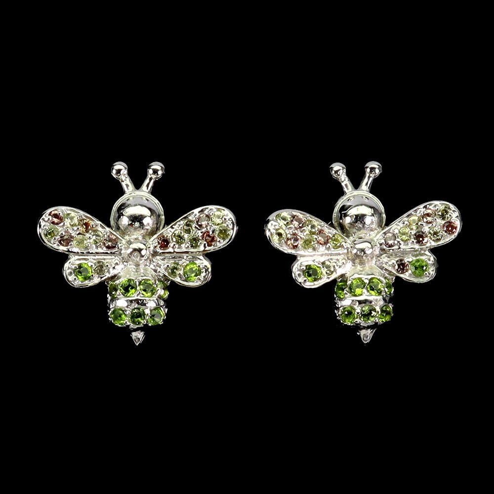 Oferujemy Państwu pozłacane białym złotem 14K, srebrne - próba 925 kolczyki z naturalnymi szafirami Songea i diopsydami. Piękne pszczoły.