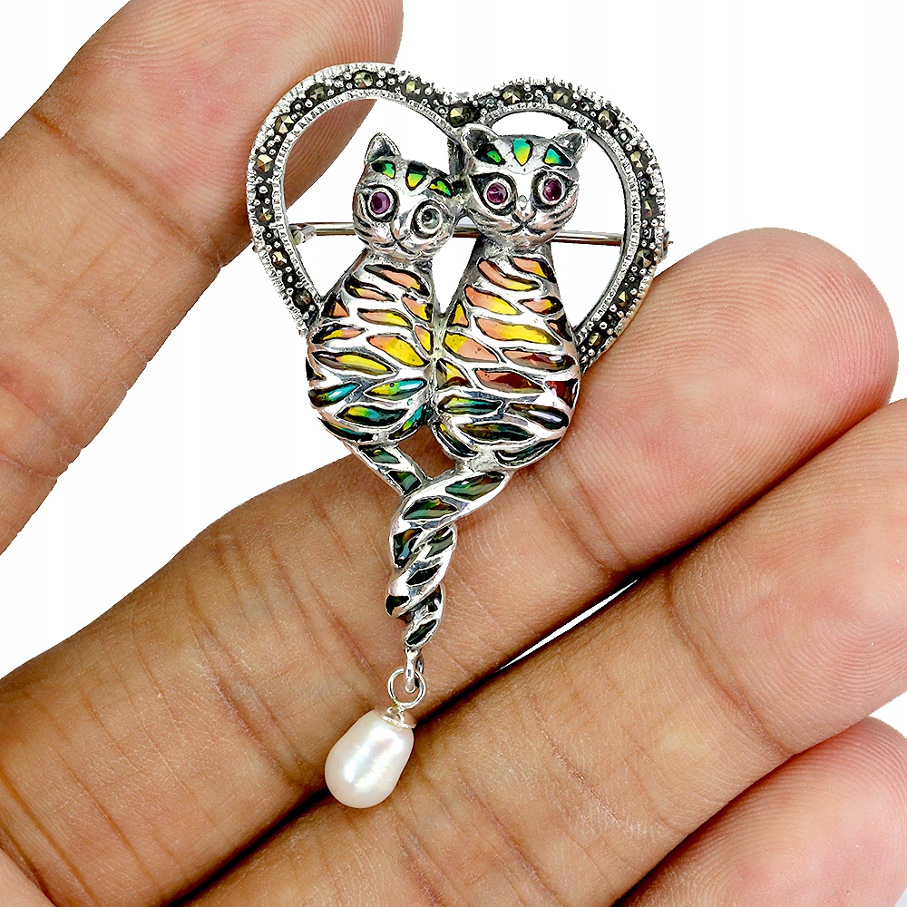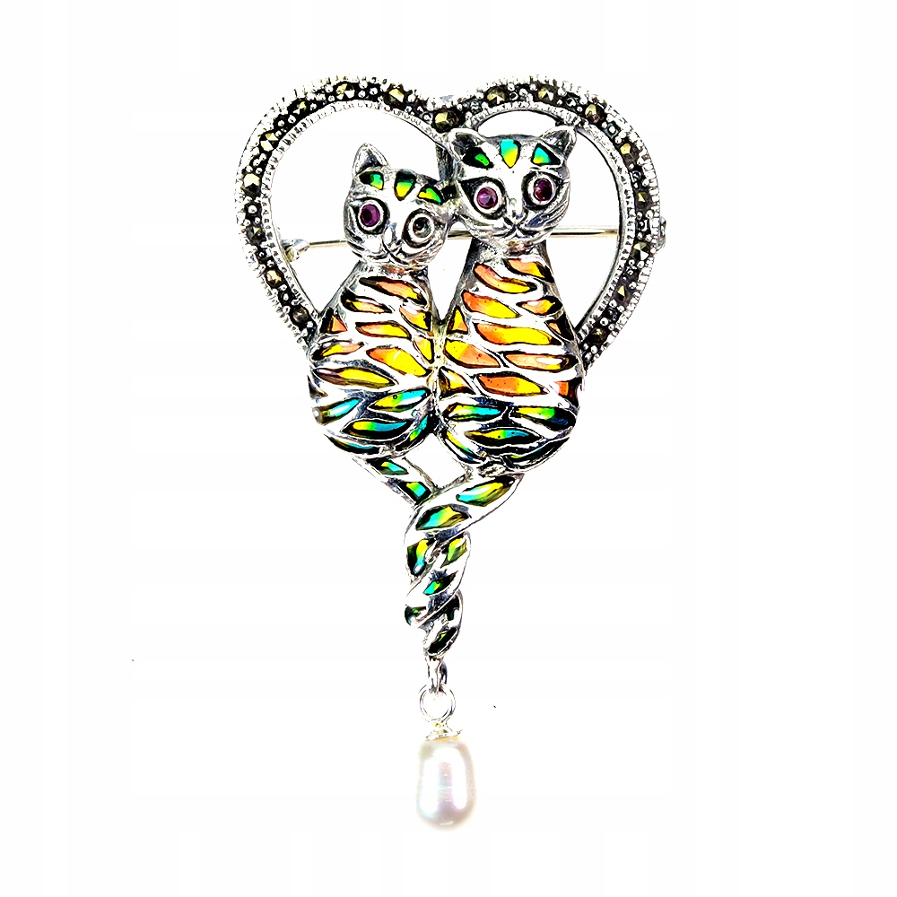 Srebrna emaliowana broszka wisiorek kot naturalne markazyty rubiny perła