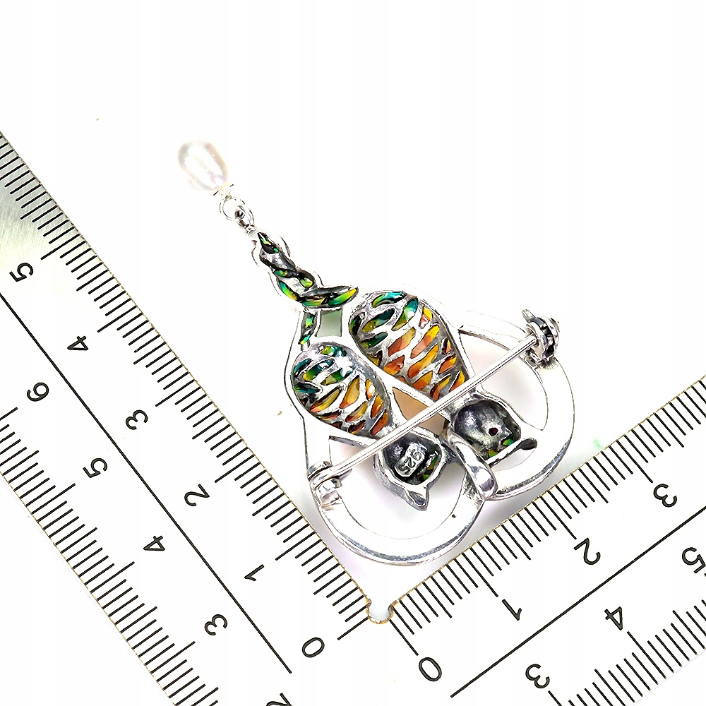 Oferujemy Państwu srebrną - próba 925 - emaliowaną broszkę/wisiorek z naturalnymi markazytami, perłą i rubinami.