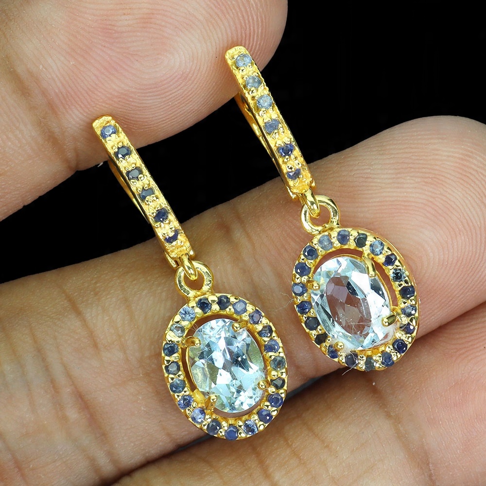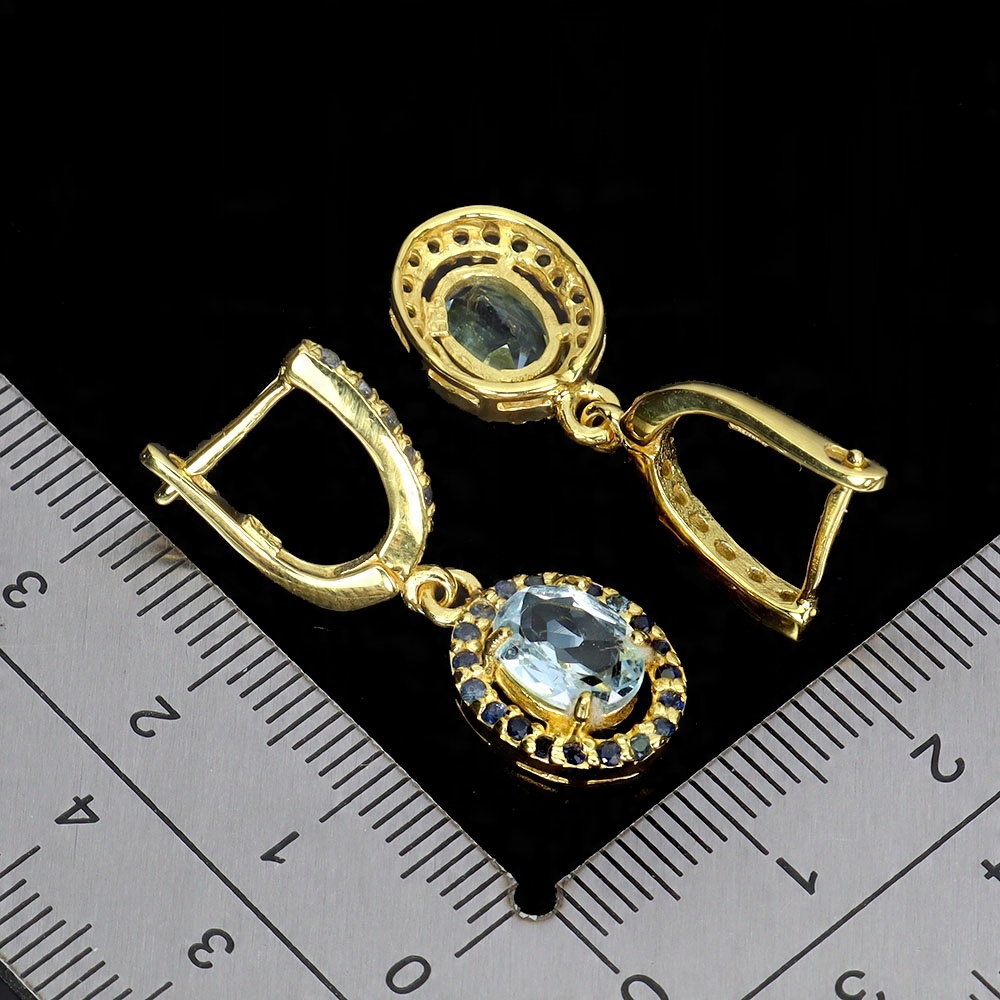 Oferujemy Państwu pozłacane 14K żółtym złotem, srebrne - próba 925 - kolczyki z naturalnymi topazami sky blue i niebieskimi szafirami.