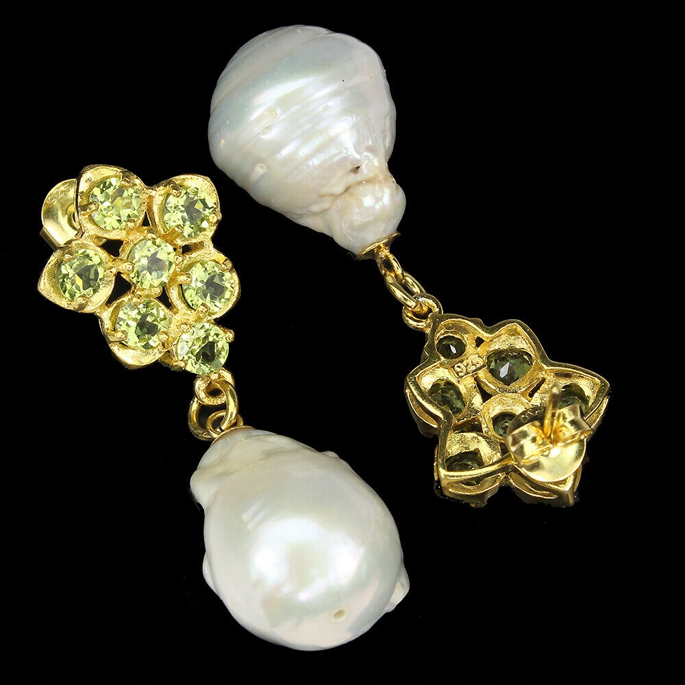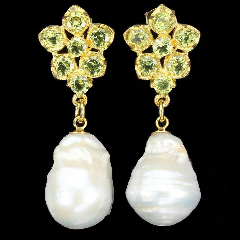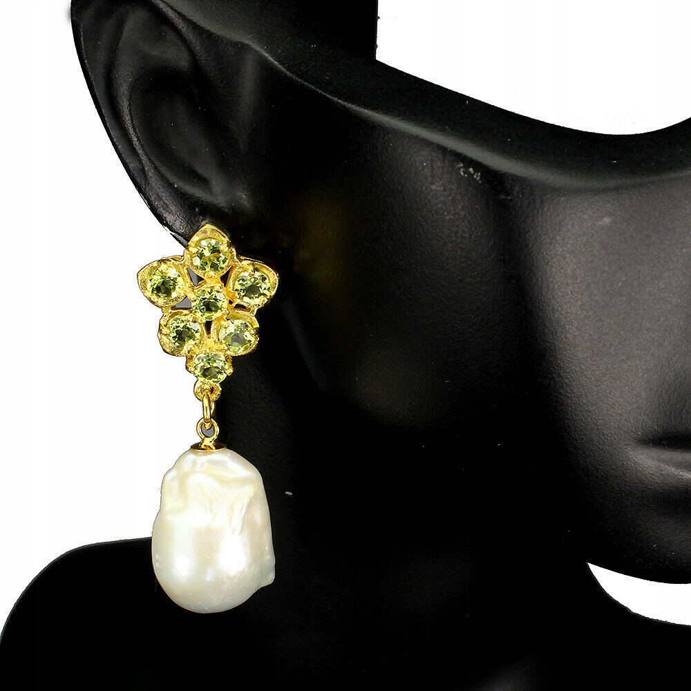Oferujemy Państwu nowe, pozłacane żółtym złotem 14K, srebrne próba 925 kolczyki z naturalnymi oliwinami i perłami.