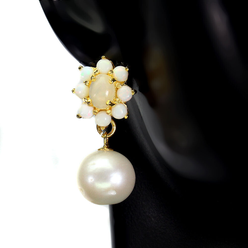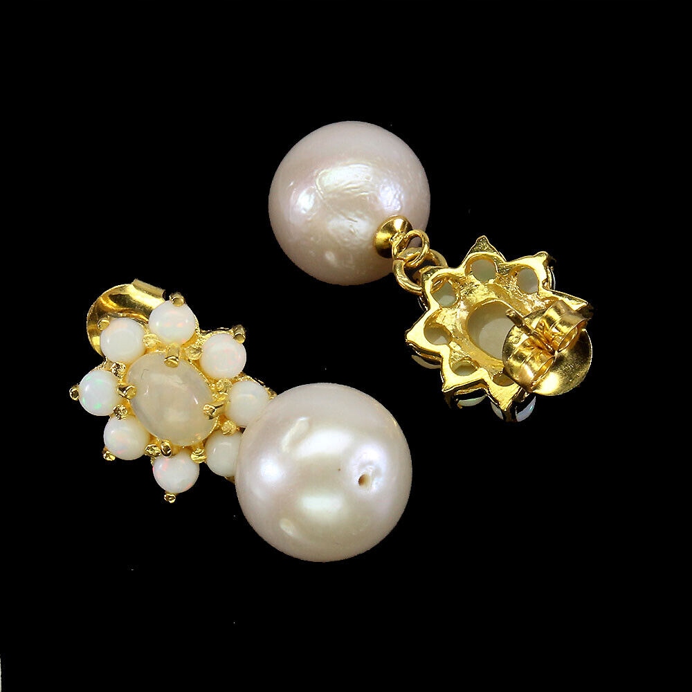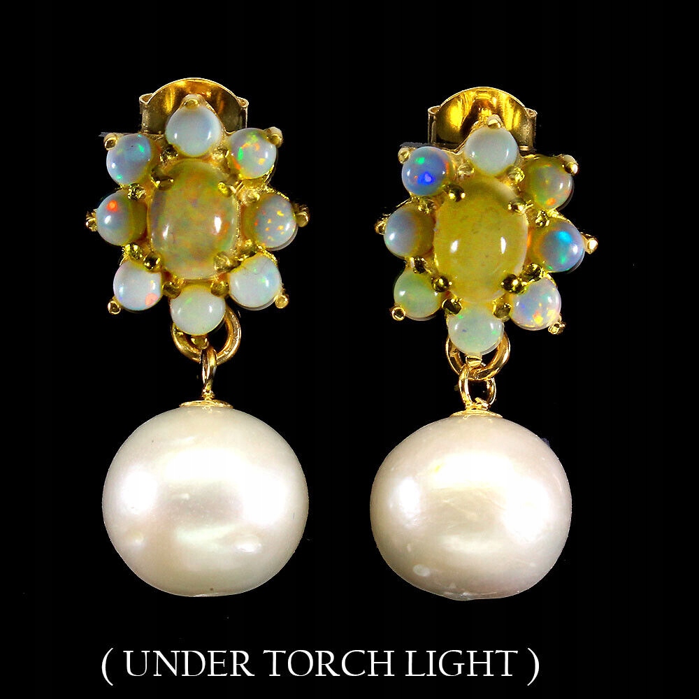 Oferujemy Państwu nowe, pozłacane żółtym złotem 14K, srebrne próba 925 kolczyki z naturalnymi opalami ognistymi i perłami.