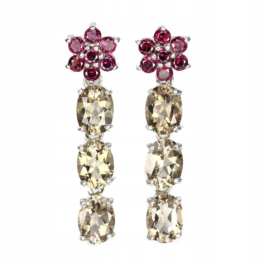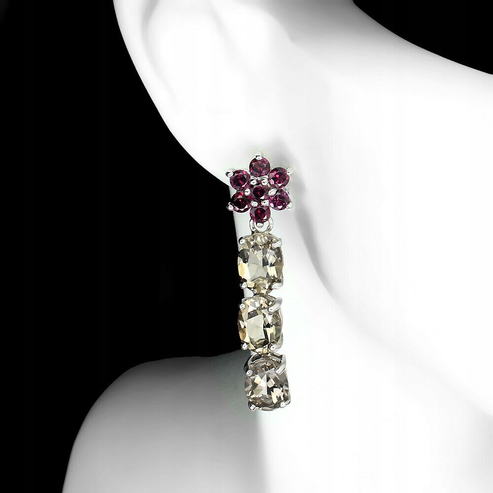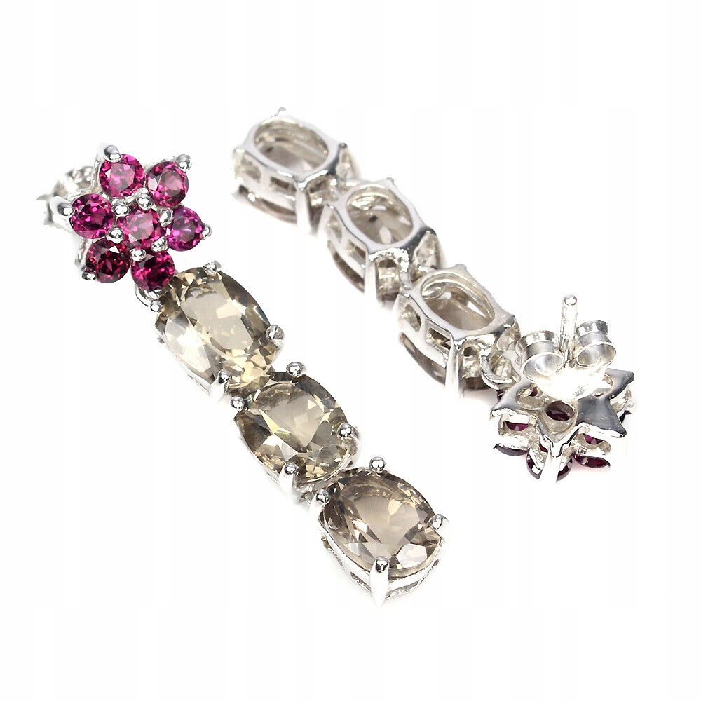 Oferujemy Państwu nowe, pozłacane 14K białym złotem, srebrne - próba 925 kolczyki z naturalnym kwarcem dymnym i granatami (rodolitami).