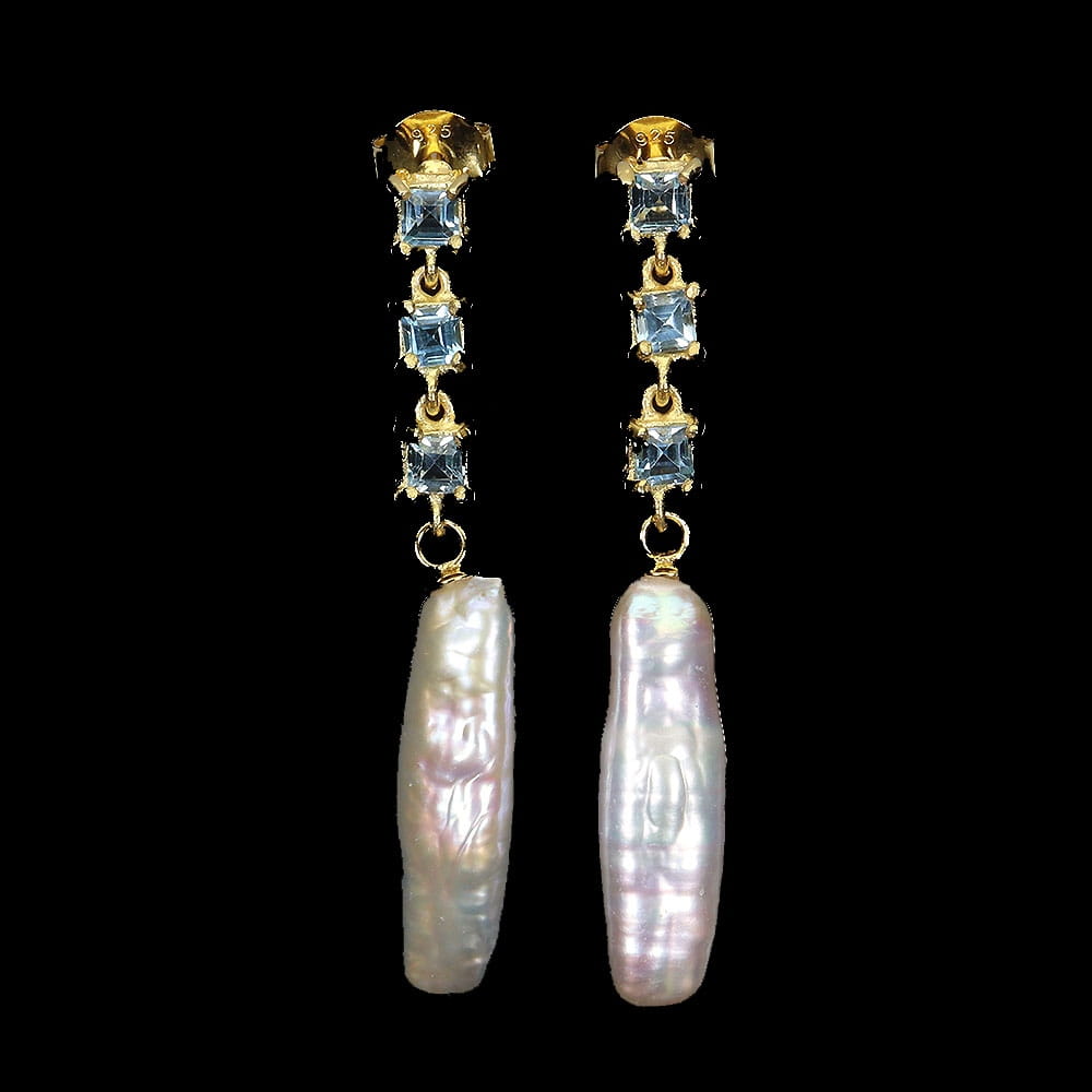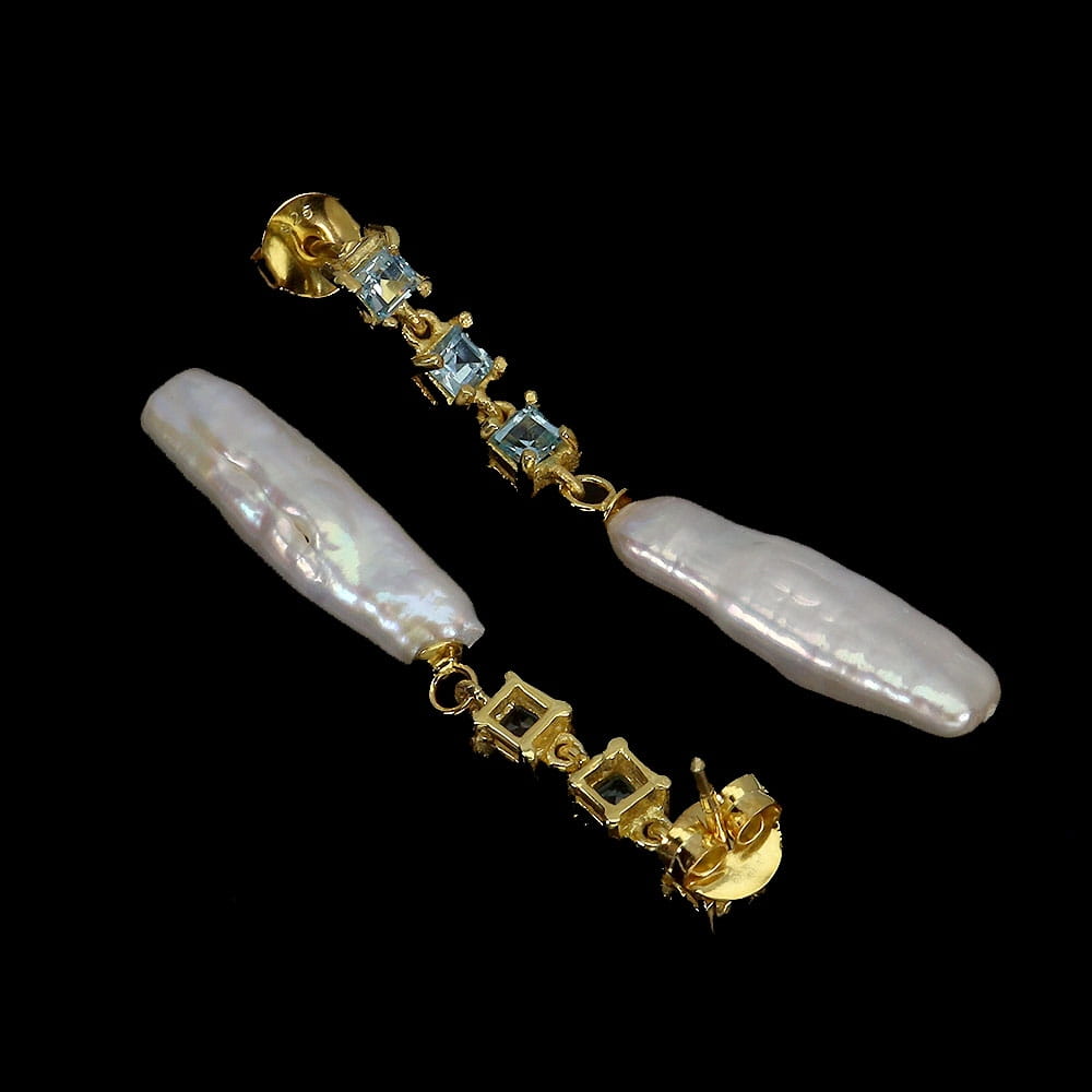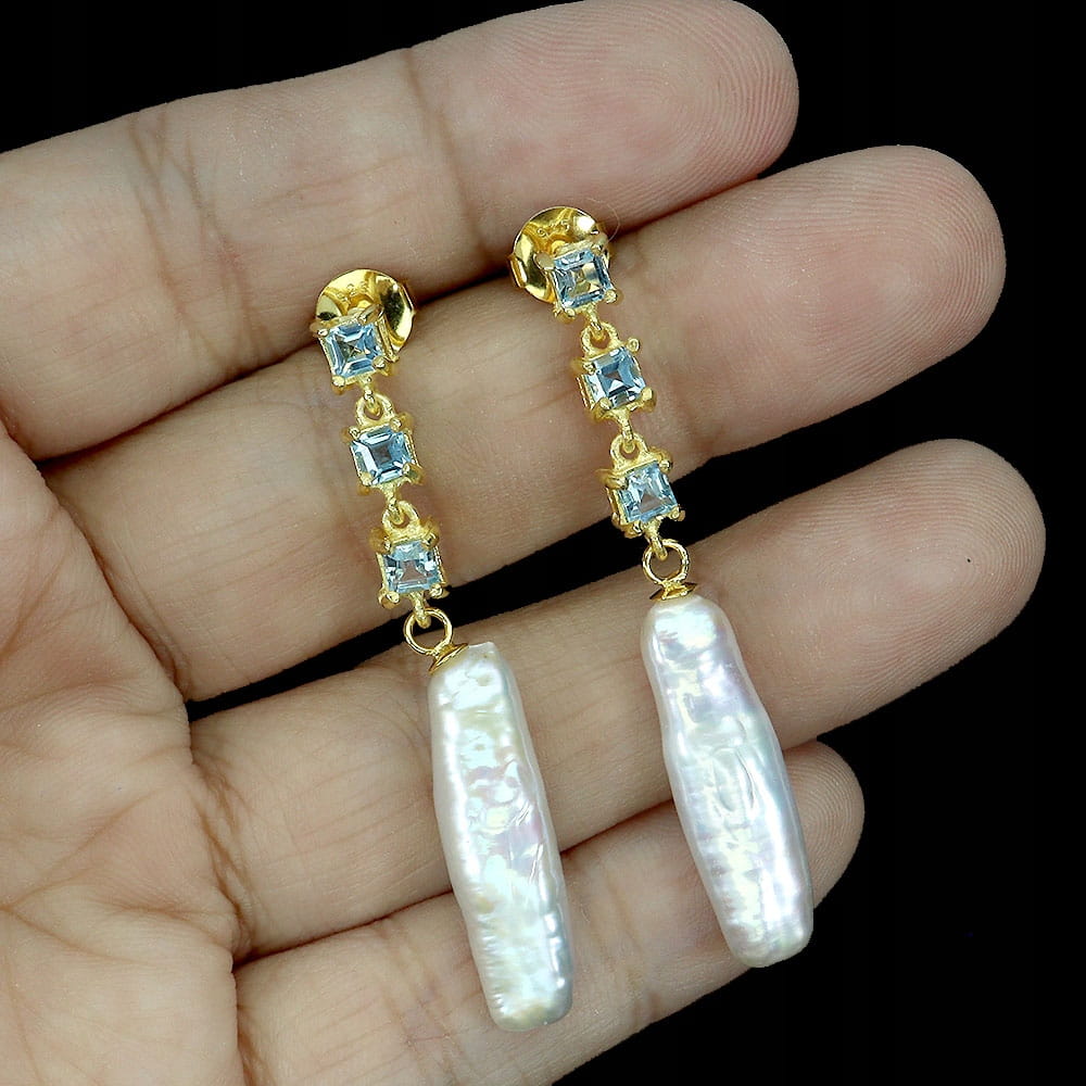 Oferujemy Państwu nowe, pozłacane żółtym złotem 14K, srebrne próba 925 kolczyki z naturalnymi sky blue topazami i perłami.