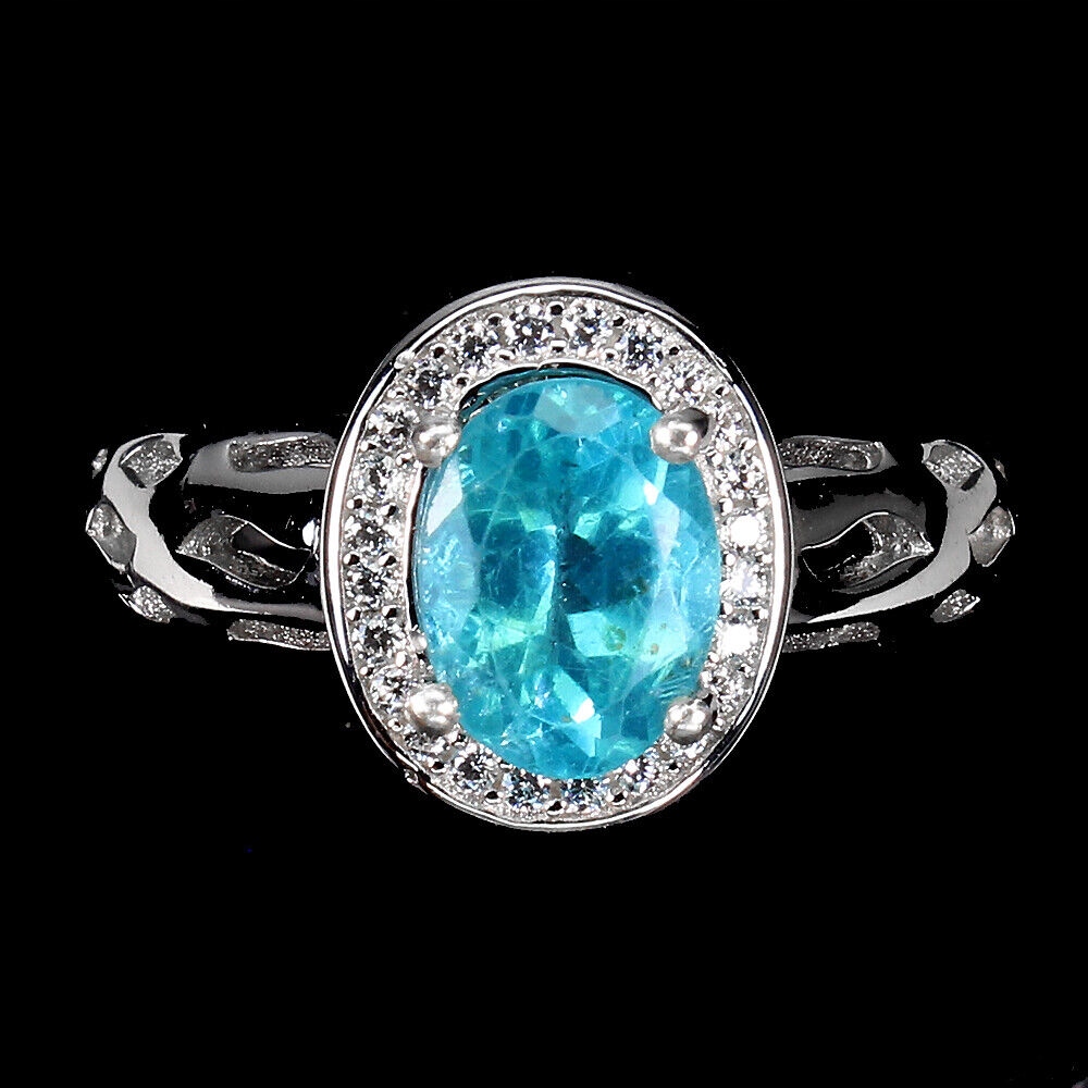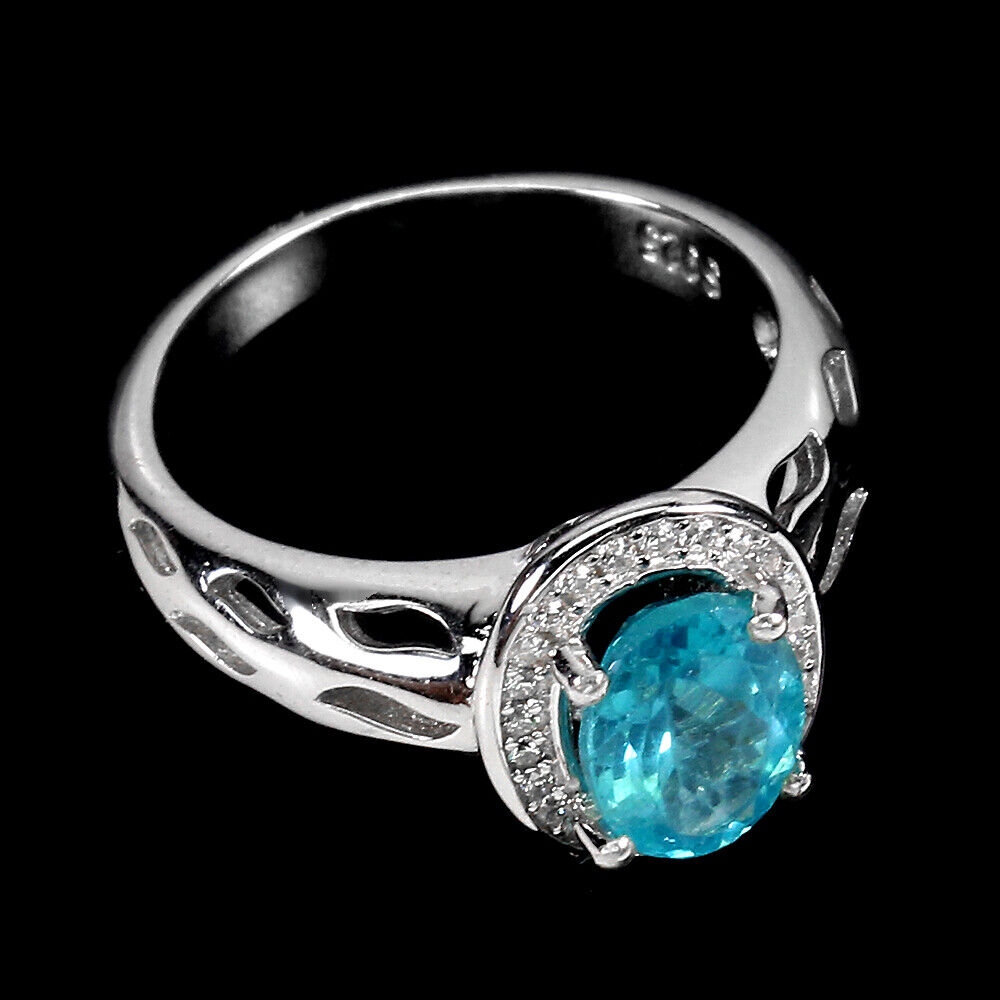 Oferujemy Państwu nowy, pozłacany 14K białym złotem, srebrny - próba 925 - pierścionek z naturalnym apatytem neon blue i cyrkoniami.