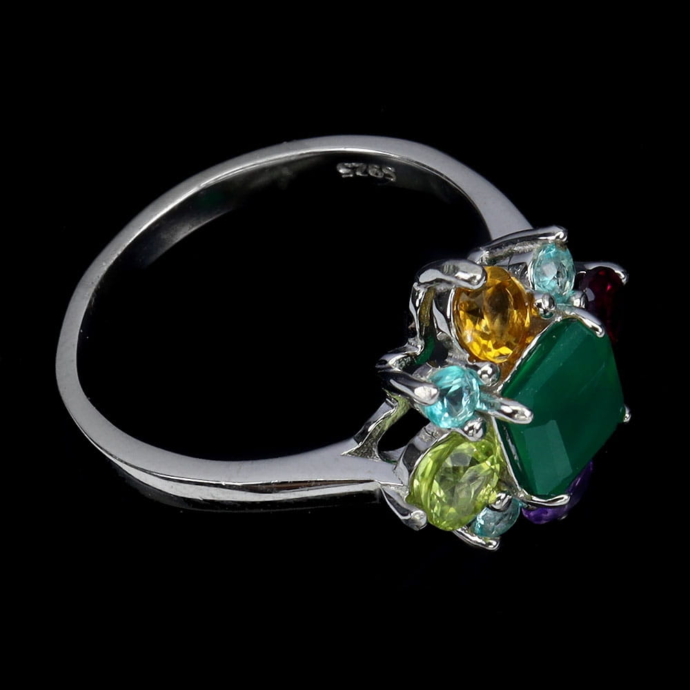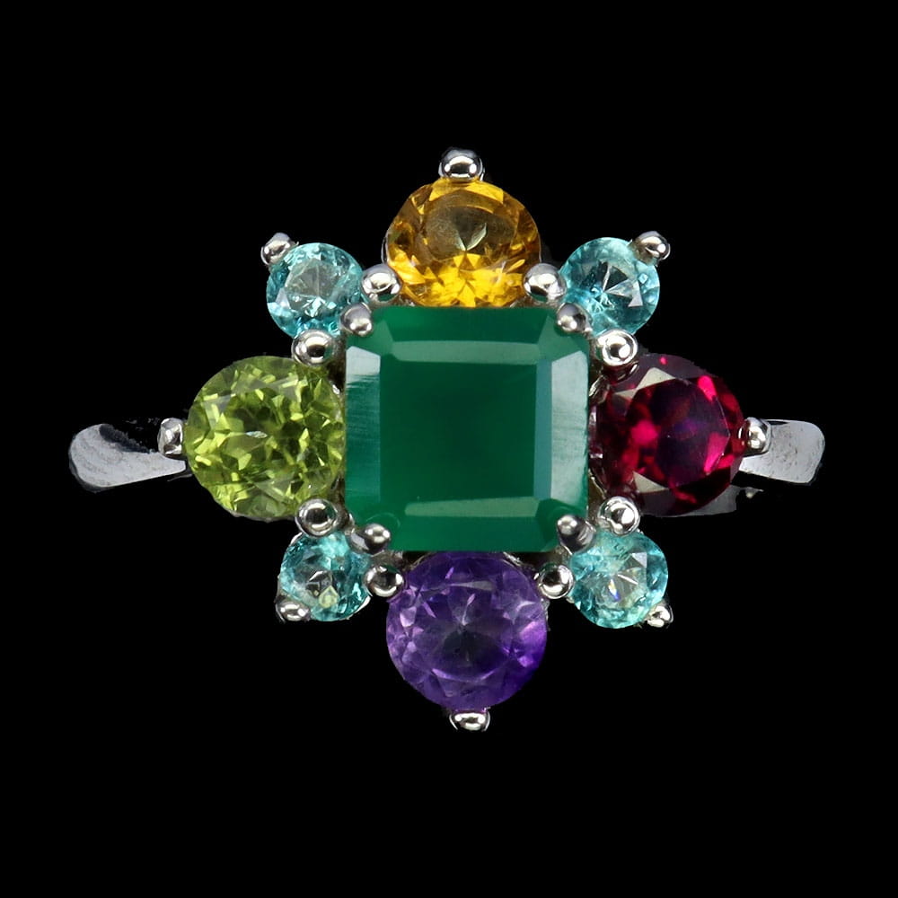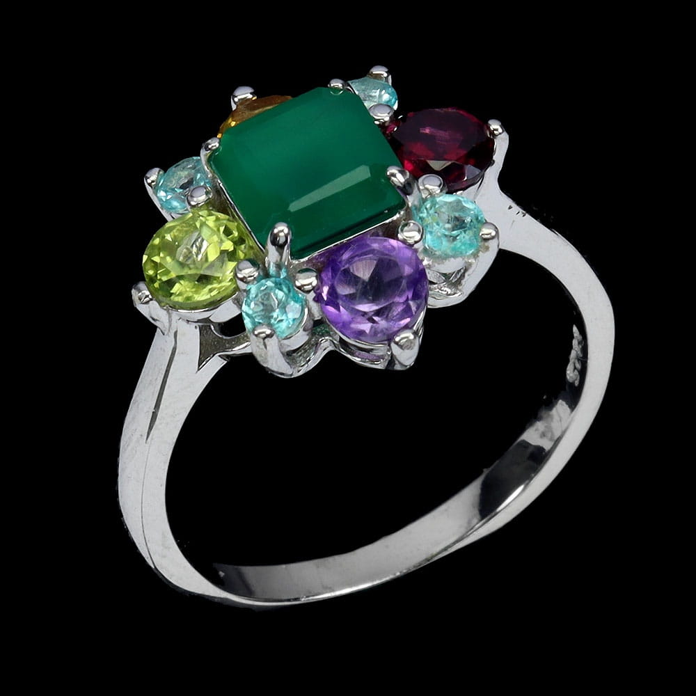 Oferujemy Państwu nowy, pozłacany 14K białym złotem, srebrny - próba 925 - pierścionek z naturalnym awenturynem AAA, ametystem, apatytami, cytrynem, oliwinem i granatem (rodolitem).