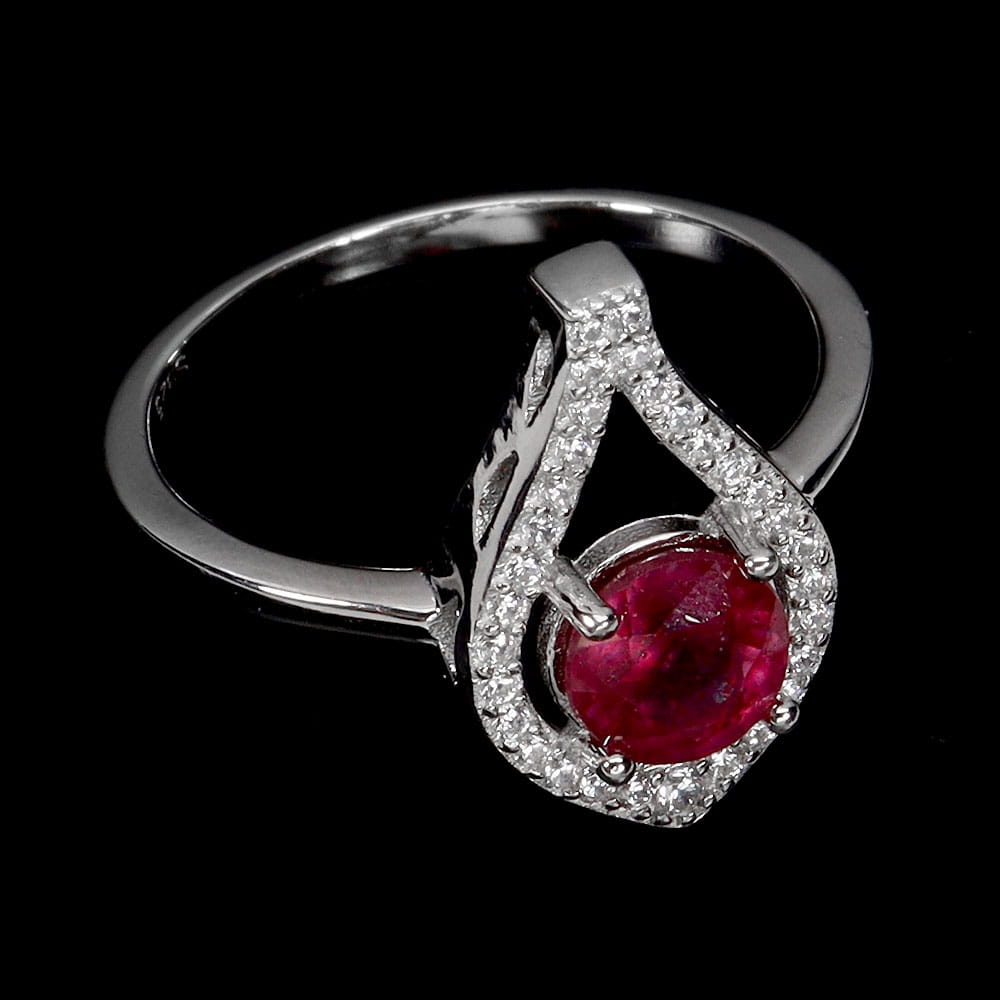 Oferujemy Państwu pozłacany białym 14K złotem, srebrny - próba 925 pierścionek z naturalnym rubinem i cyrkoniami.