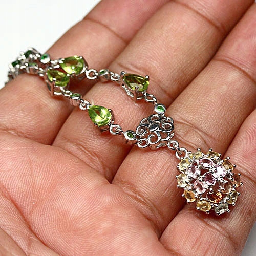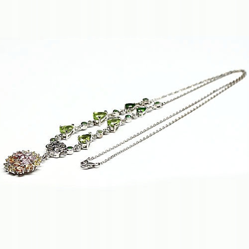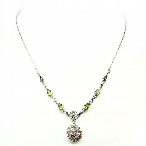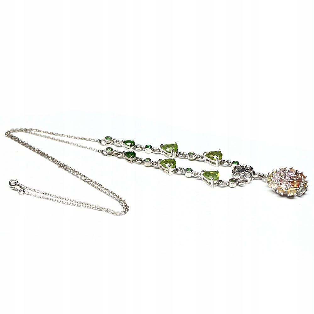 oferujemy Państwu nowy pozłacany białym 14K złotem srebrny - próba 925 naszyjnik z naturalnymi tsaworytami, diopsydami, oliwinami, szafirami i granatami.