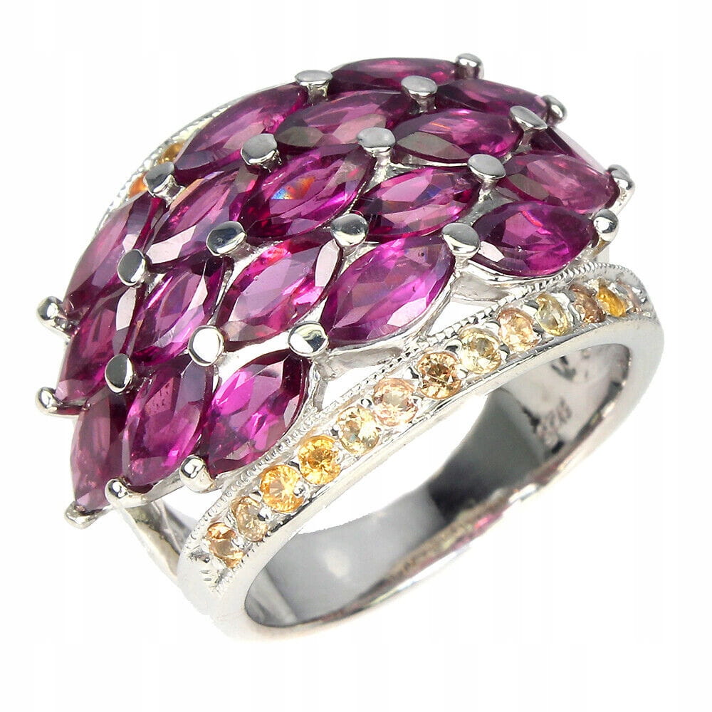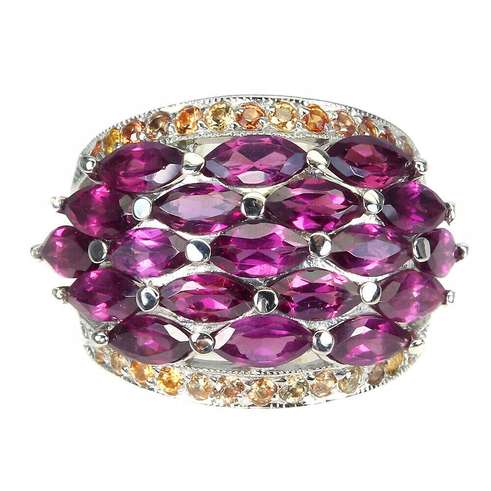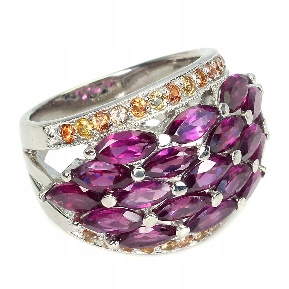 Oferujemy Państwu nowy, pozłacany 14K białym złotem srebrny - próba 925 pierścionek z naturalnymi granatami (rodolitami) i szafirami Songea.