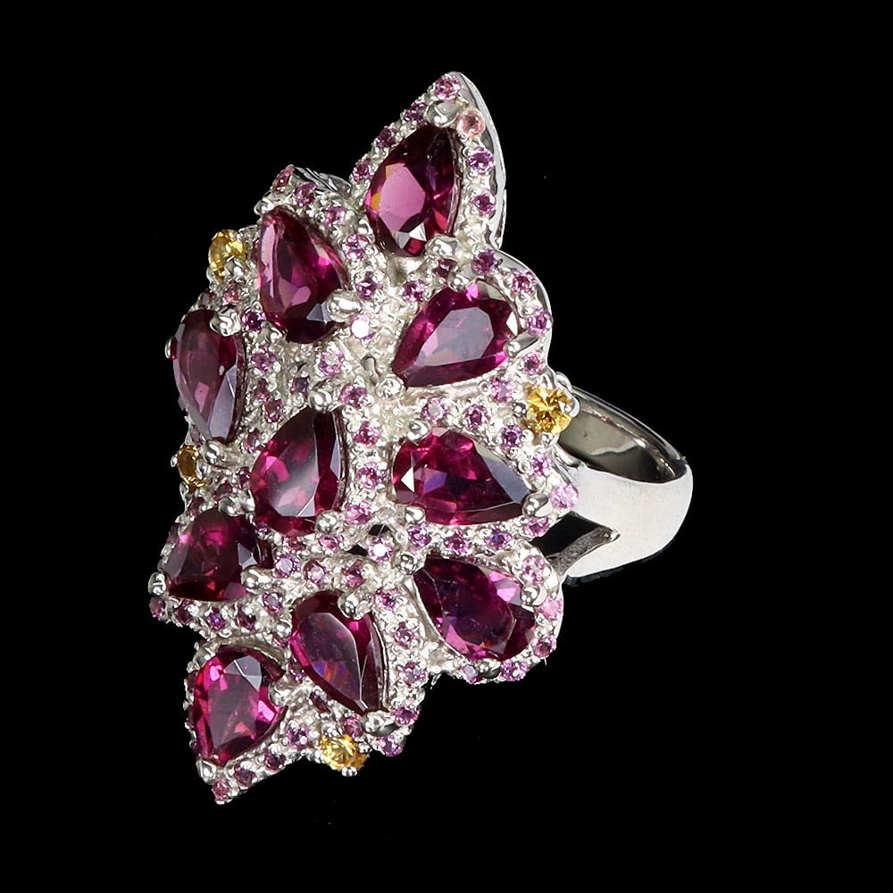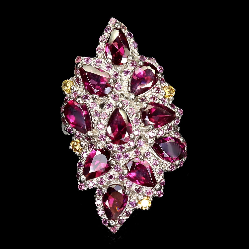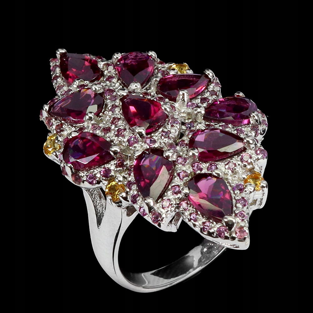 Oferujemy Państwu nowy, pozłacany 14K białym złotem srebrny - próba 925 pierścionek z naturalnymi granatami (rodolitami) i szafirami Songea.