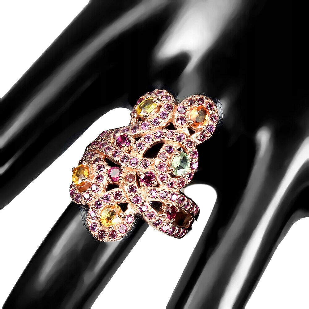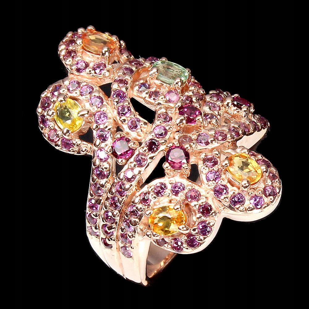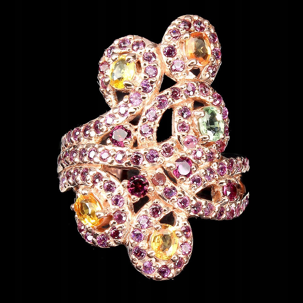 Oferujemy Państwu nowy, pozłacany 14K różowym złotem, srebrny - próba 925 pierścionek z naturalnymi granatami (rodolitami) i szafirami Songea i zielonym.