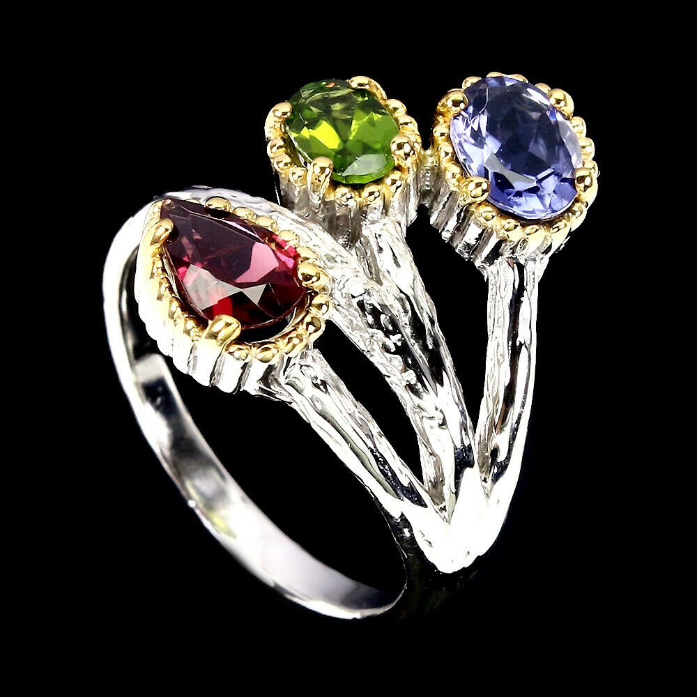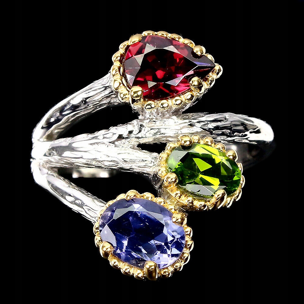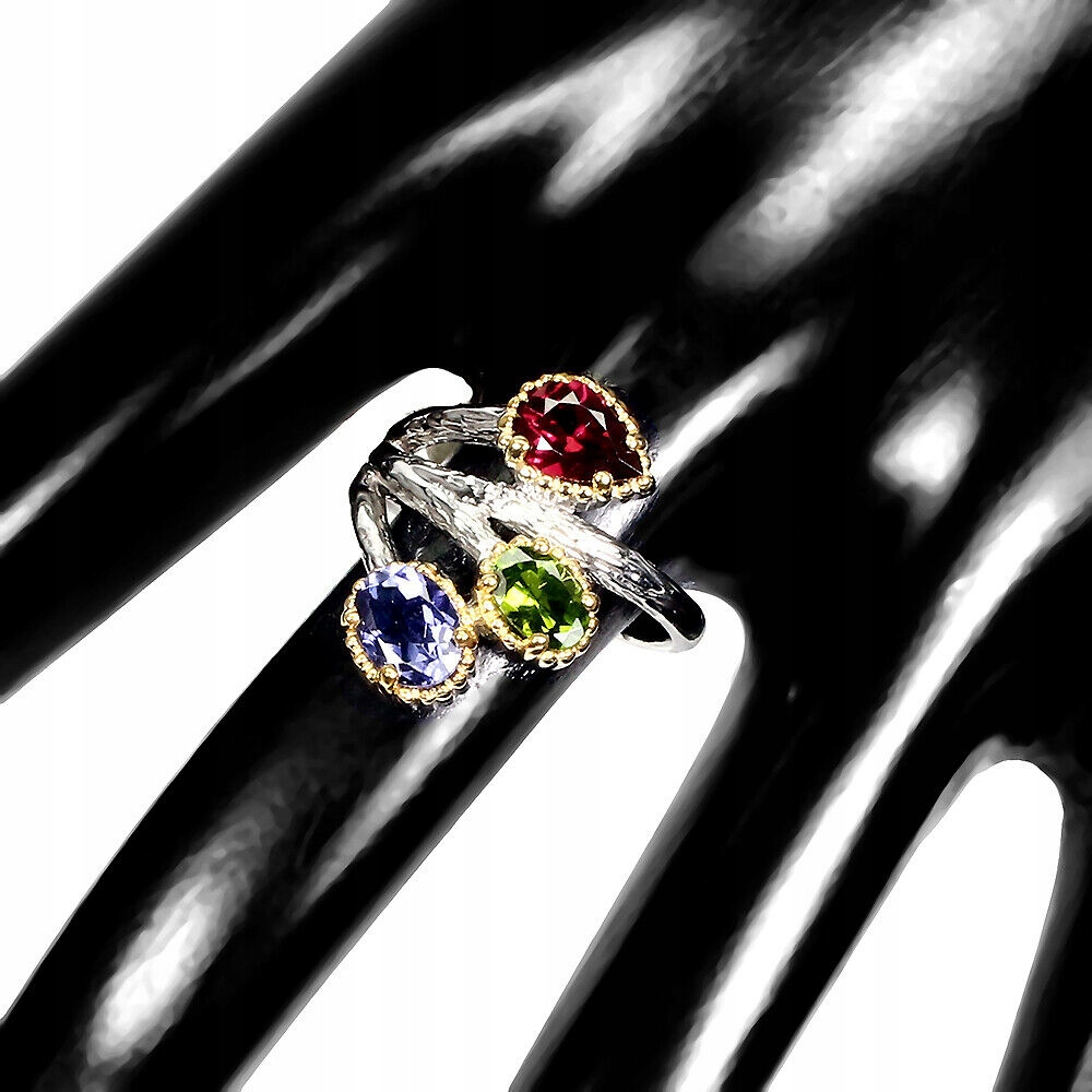 Oferujemy Państwu nowy, pozłacany białym i żółtym złotem 14K, srebrny - próba 925 pierścionek z naturalnym granatem (rodolitem), diopsydem i iolitem.