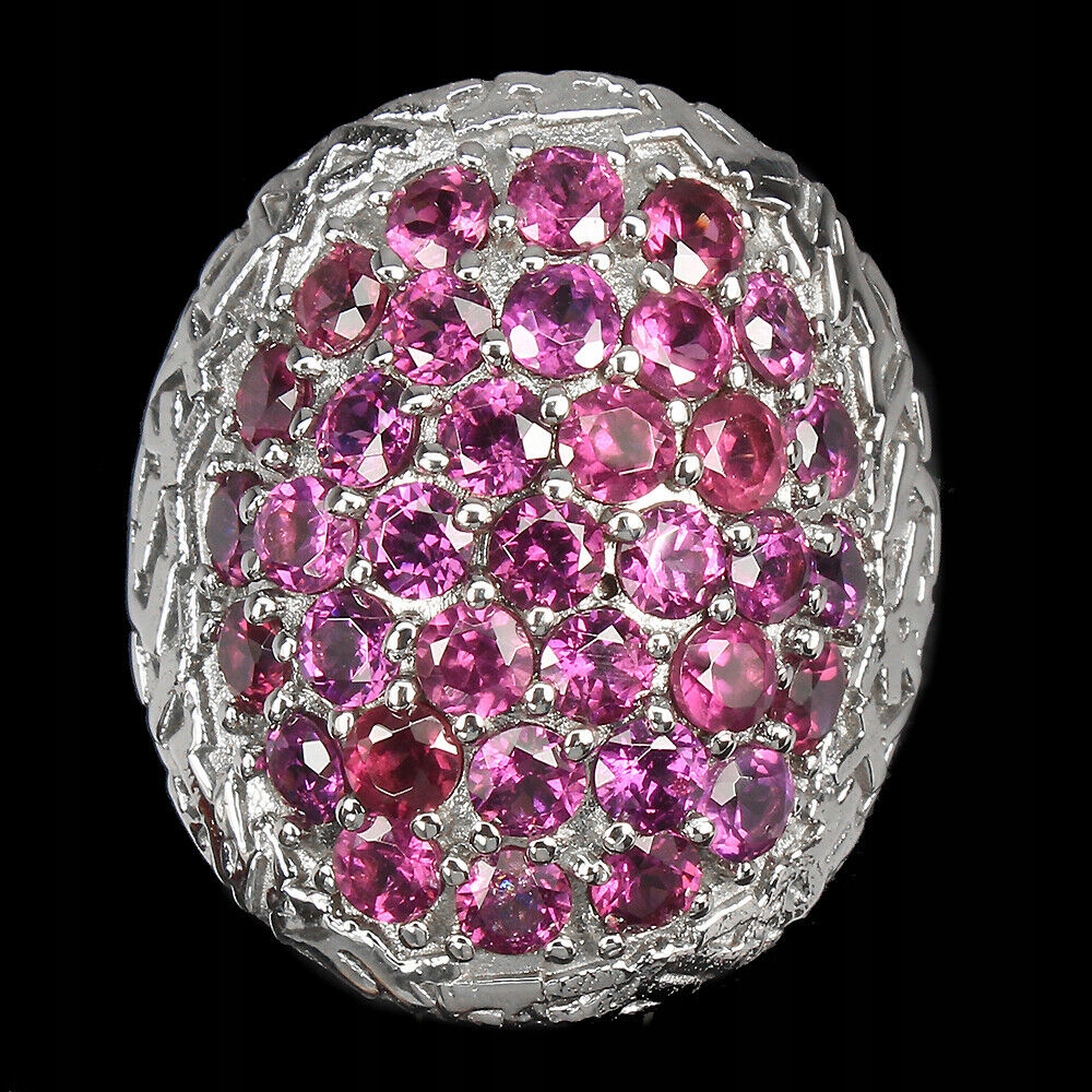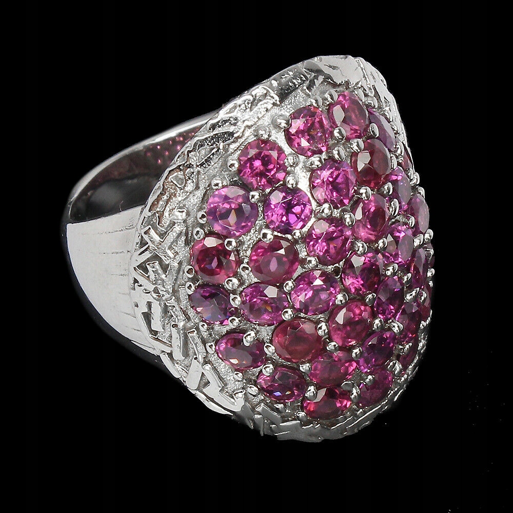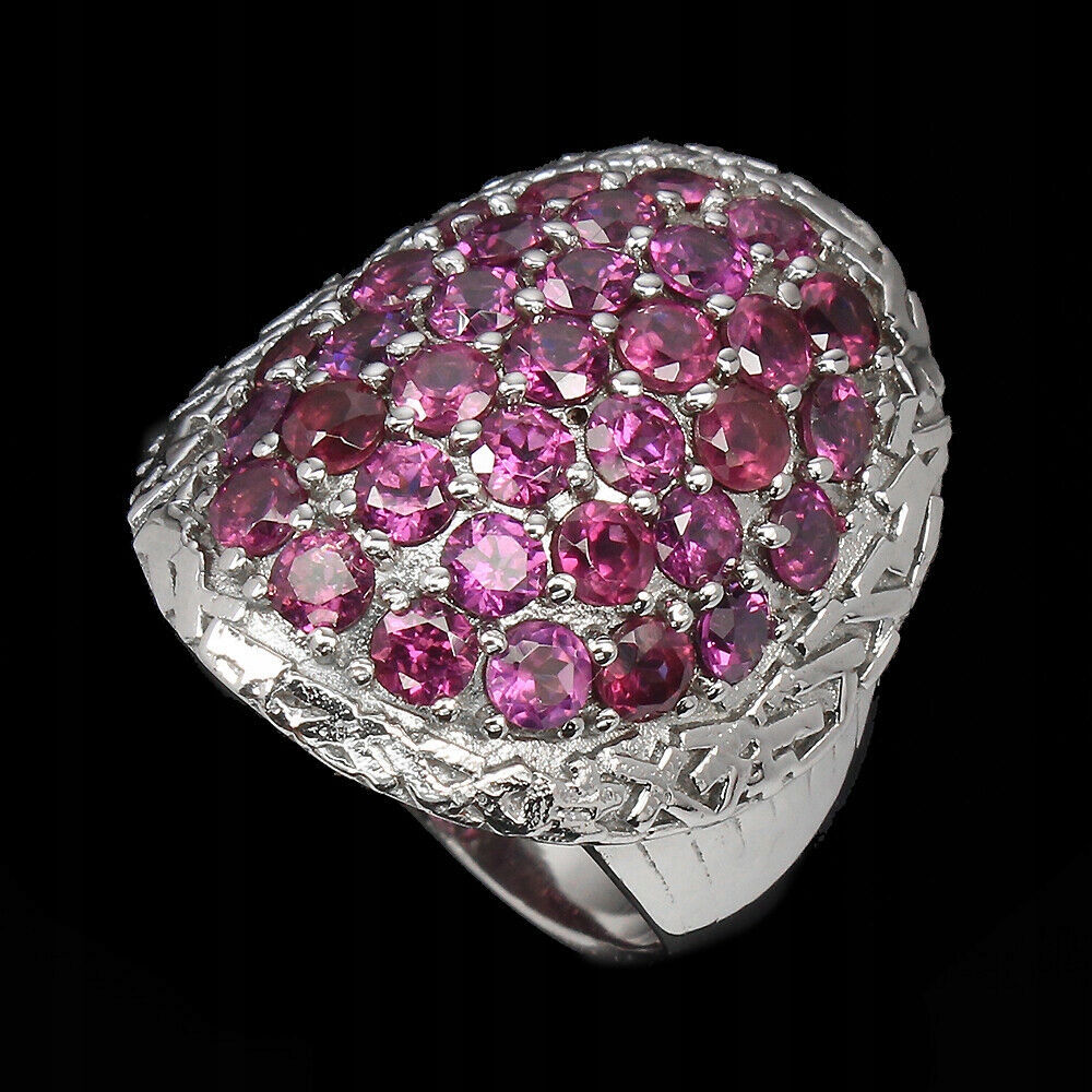 Elegancki pierścionek wykonany ze srebra próby 925, pozłacany 14K białym złotem. Ozdobiony naturalnymi granatami (rodolitami). Waga całkowita: 10.3 g, rozmiar pierścionka: 16. Pochodzenie kamieni: Afryka. Polecamy – pierścionek jest przepiękny.