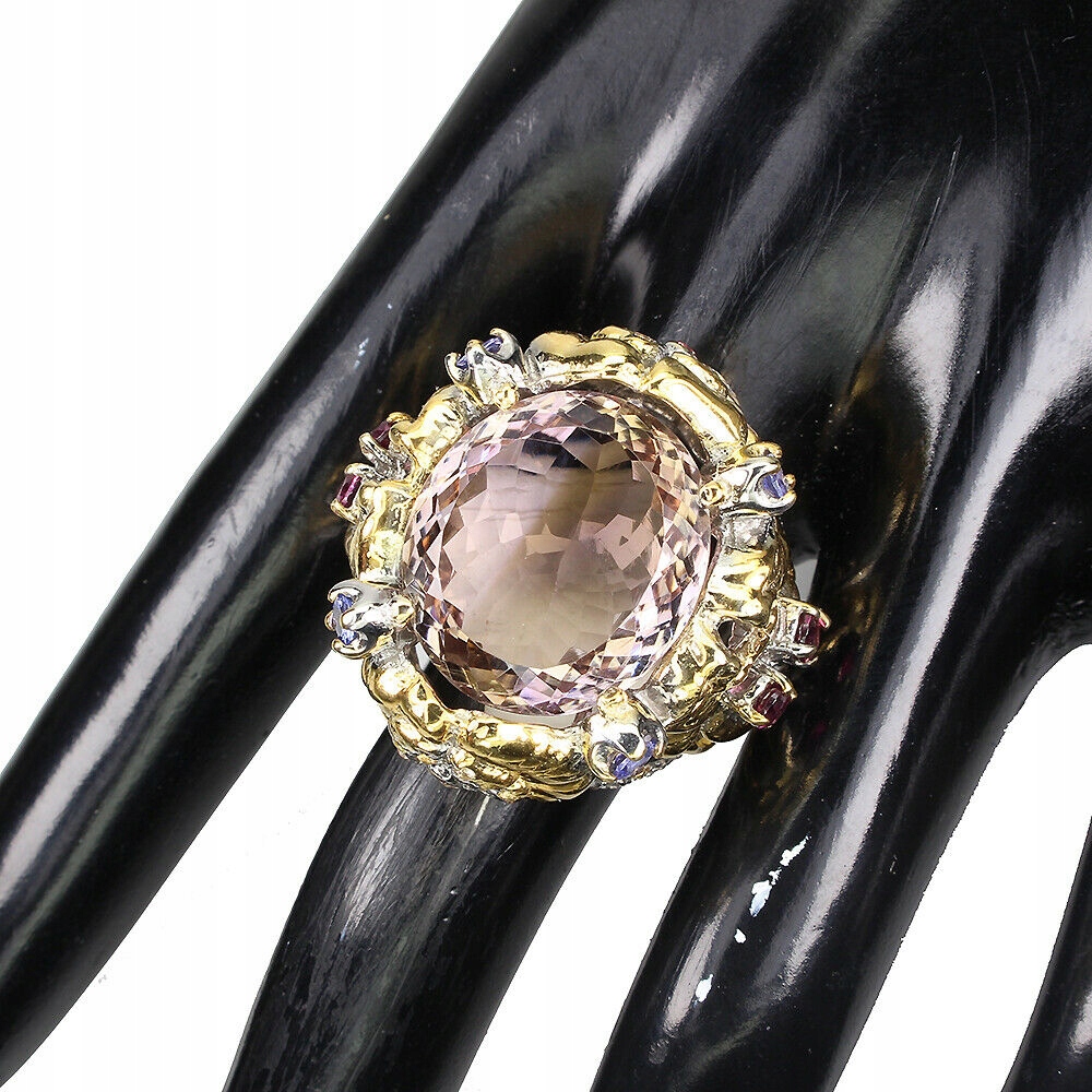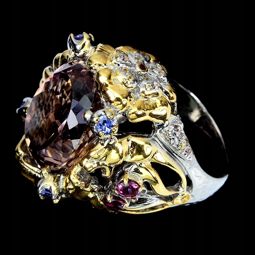 oferujemy Państwu nowy, pozłacany 14K żółtym i białym złotem, srebrny - próba 925 pierścionek z naturalnym ametrynem, tanzanitami i granatami (rodolitami).
