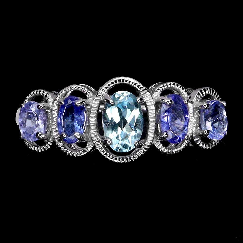 Oferujemy Państwu pozłacany białym złotem 14K, srebrny - próba 925 - pierścionek z naturalnymi tanzanitami i topazem sky blue.