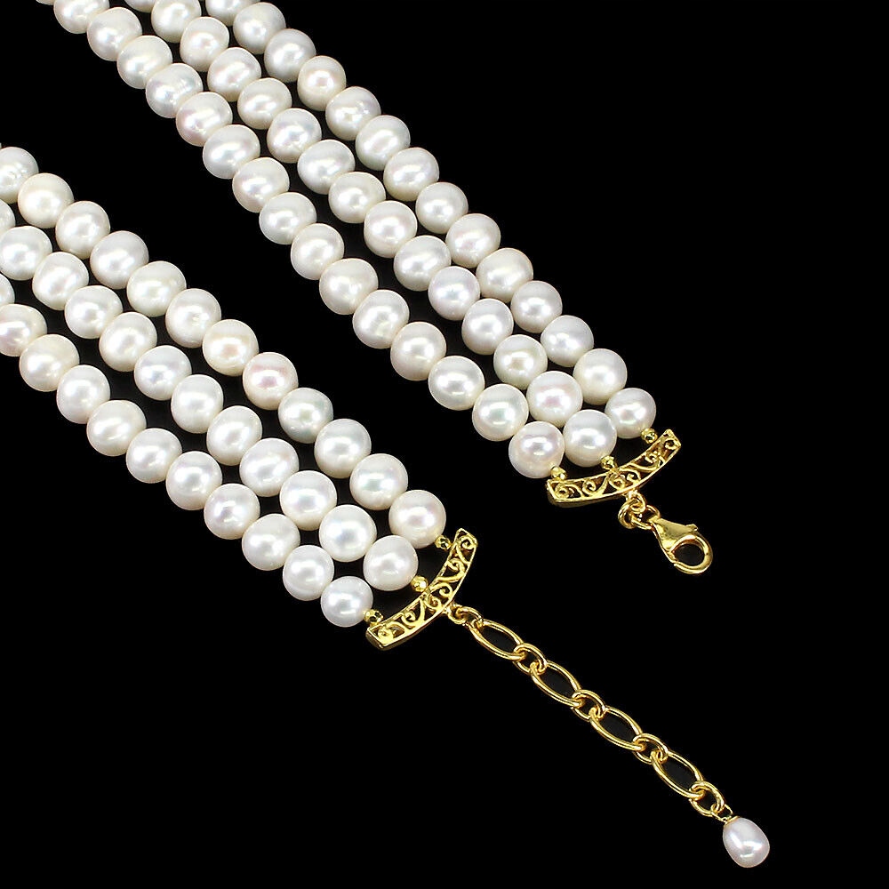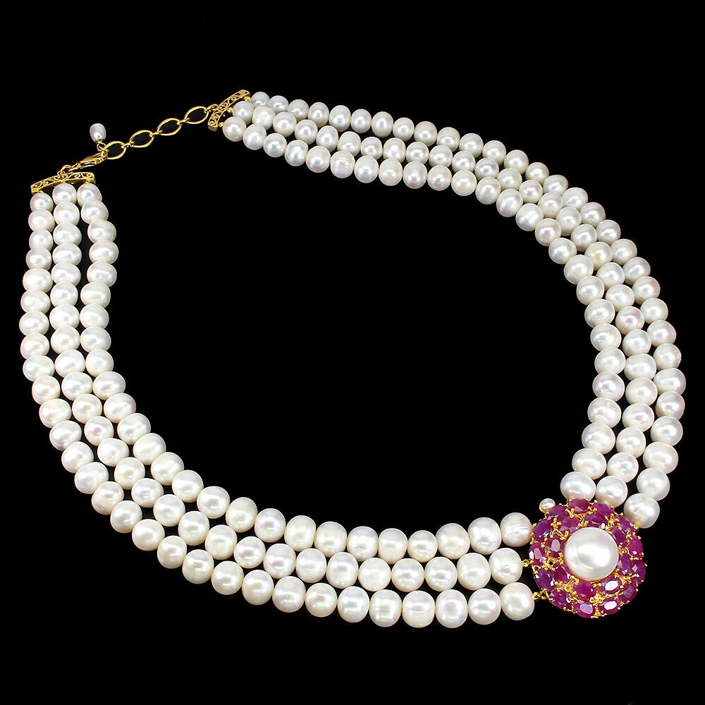 Oferujemy Państwu nowy, pozłacany 14K żółtym złotem, srebrny - próba 925 naszyjnik z naturalnymi perłami, białymi topazami i rubinami.