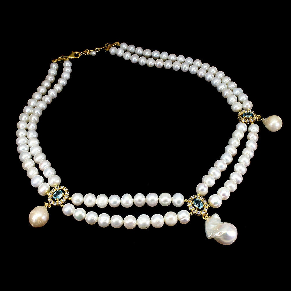 Oferujemy Państwu nowy, pozłacany żółtym 14K złotem, srebrny - próba 925 naszyjnik z naturalnymi tanzanitami, swiss blue topazami i perłami.