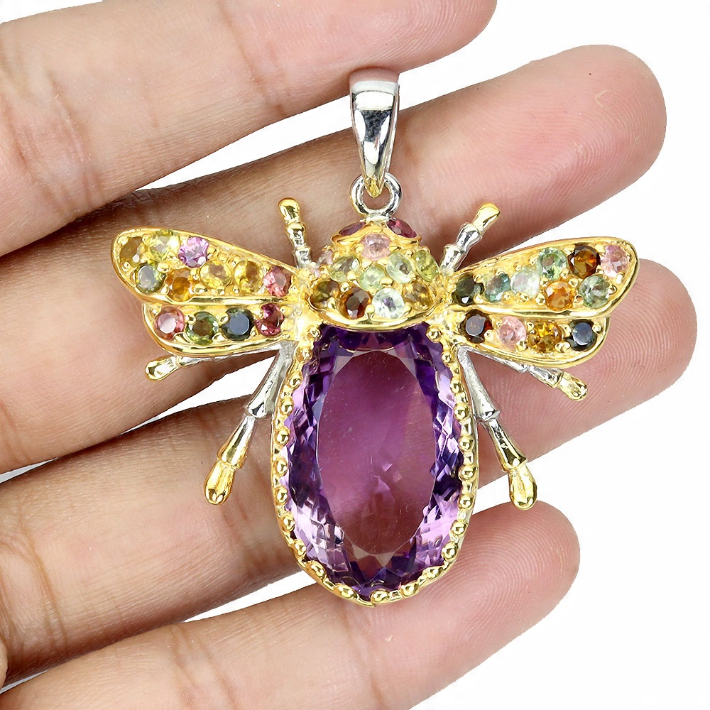 oferujemy Państwu srebrny - próba 925- wisiorek pozłacany 14K białym i żółtym złotem z naturalnym 34ct ametystem, granatami (rodolitami) i turmalinami.