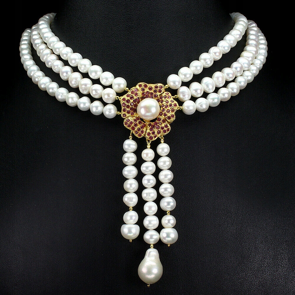 Zjawiskowy naszyjnik rubiny perły srebro naturalne