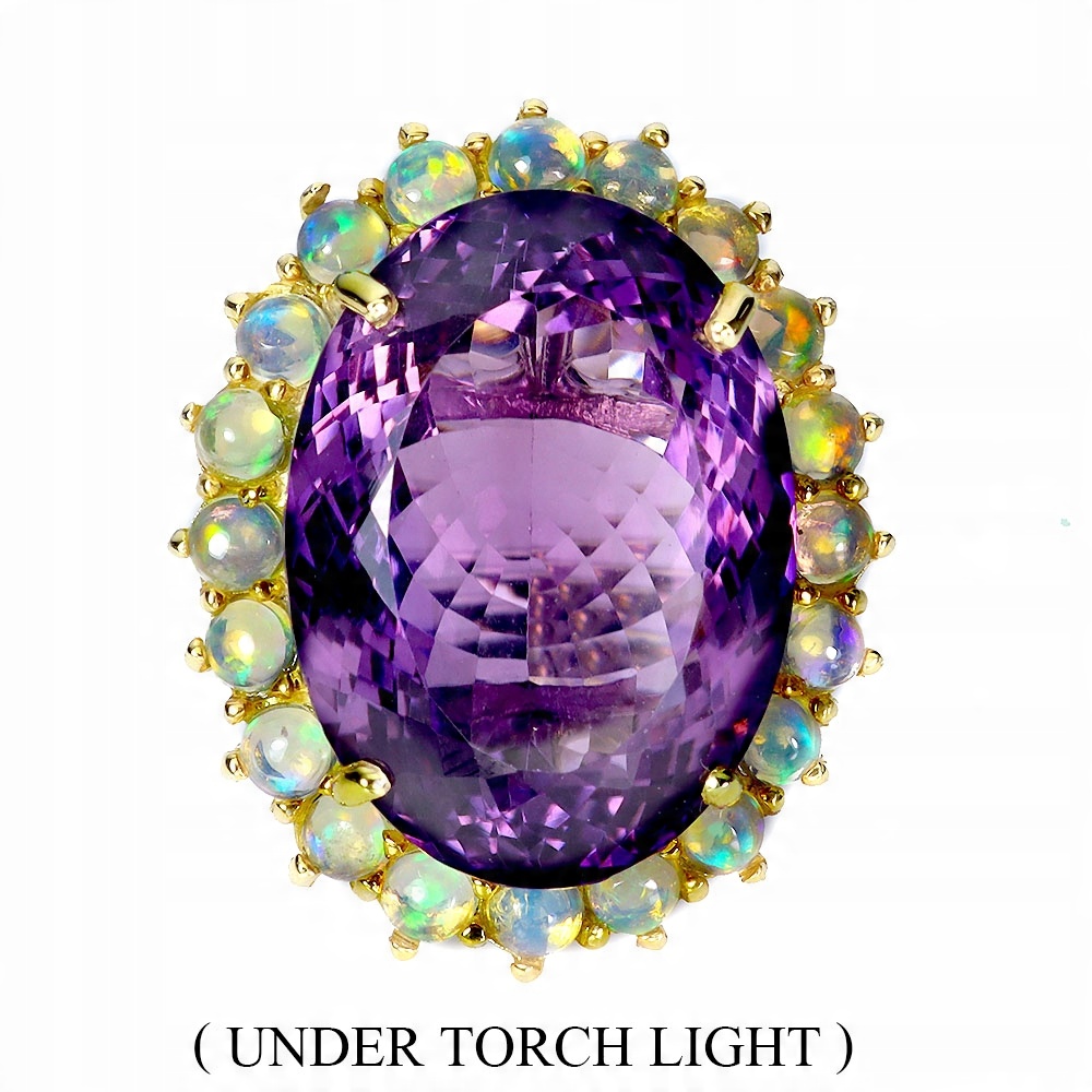 Oferujemy Państwu pozłacany białym i żółtym złotem 14K, srebrny - próba 925 - pierścionek z naturalnym 54ct ametystem i opalami ognistymi.