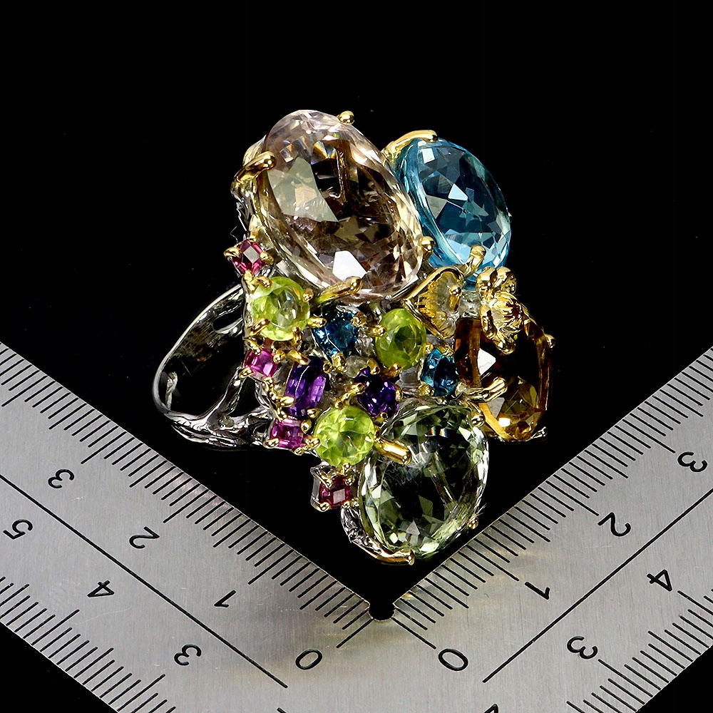 Oferujemy Państwu pozłacany białym i żółtym złotem 14K, srebrny - próba 925 - pierścionek z naturalnym cytrynem, ametrynem, prasiolitem (nazywanym zielonym ametystem), siwss blue topazem, granatami (rodolitami), oliwinami, ametystami i london blue topazami. Łączna waga dużych kamieni to 50 ct.